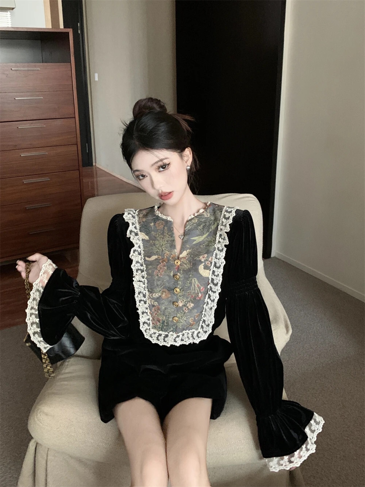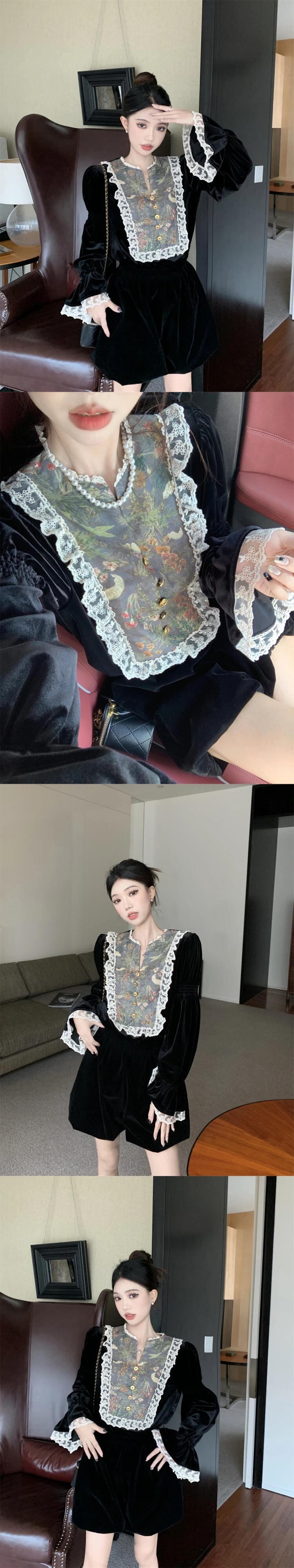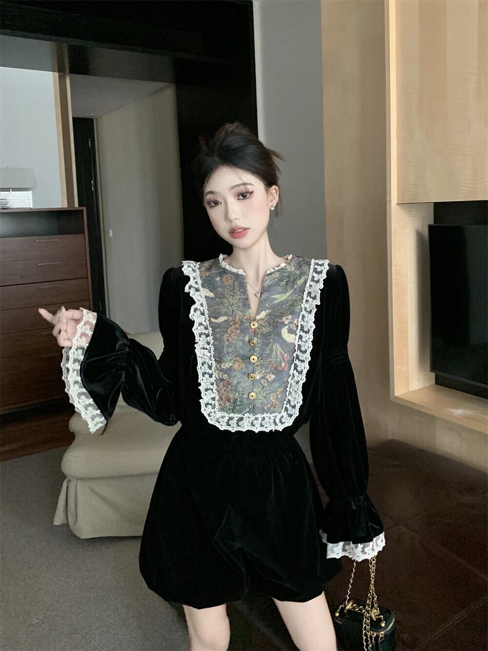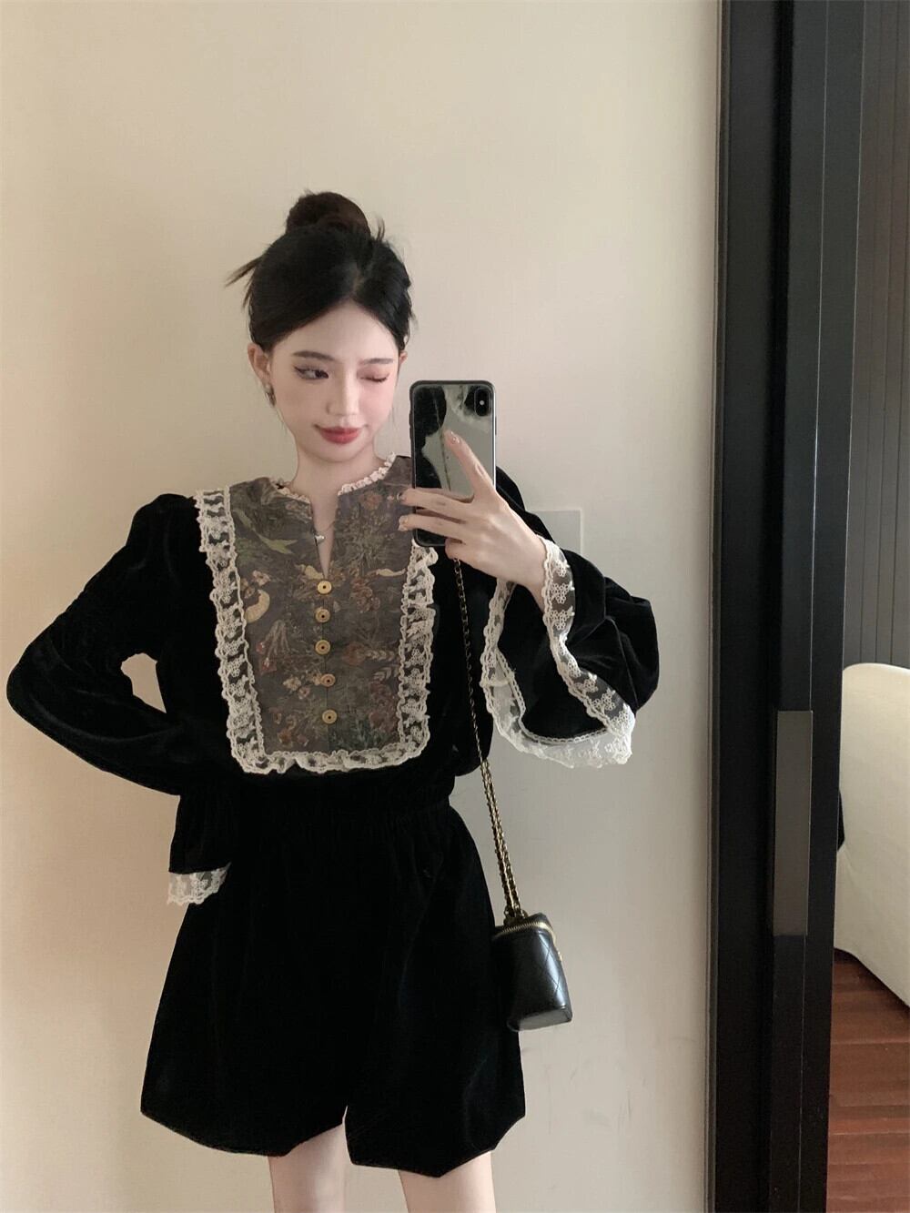 フレンチスイートホットガールレトロスーツ冬レースエッジベルベットトップウエストショーツツーピースセット 大人ガーリー スウィート キュート カジュアル ウィンター 冬物 ブルマー