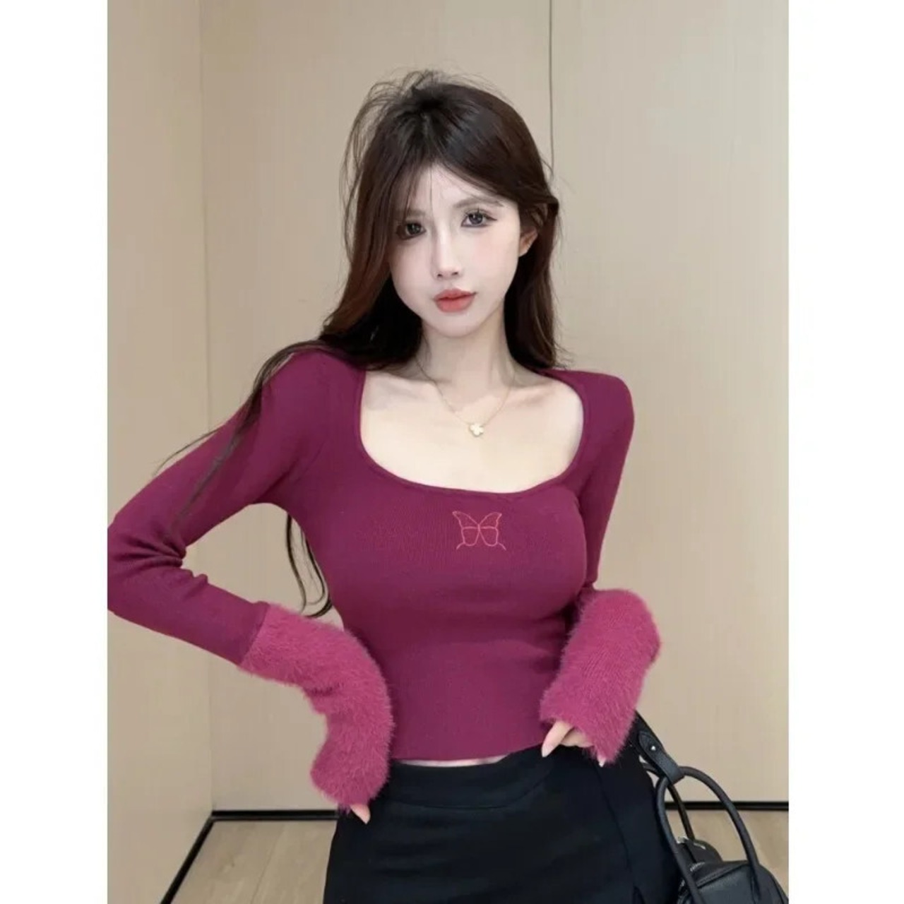 純粋セクシーホットガールイミテーションミンクファースリムフィットセーター秋/冬無地蝶柄長袖トップ ロング オータム 秋物 ウィンター 冬物 ソリッドカラー