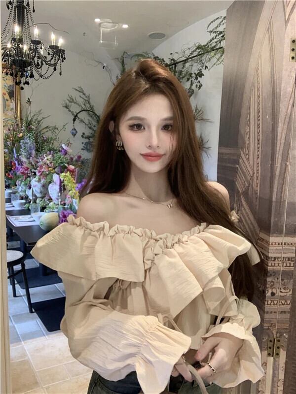 フレンチスイートホットガール長袖オフショルダーシャツ秋/冬フリルエッジスリムフィットショートトップ ロング 大人ガーリー スウィート キュート カジュアル オータム 秋物 ウィンター 冬物