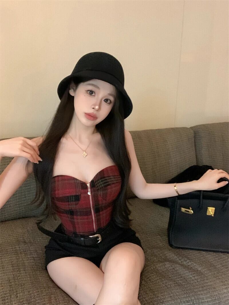 純粋セクシーホットガールチェック柄対照的色ウールタンク秋/冬クリスマススリムフィットジッパー付きベスト レッド オータム 秋物 ウィンター 冬物
