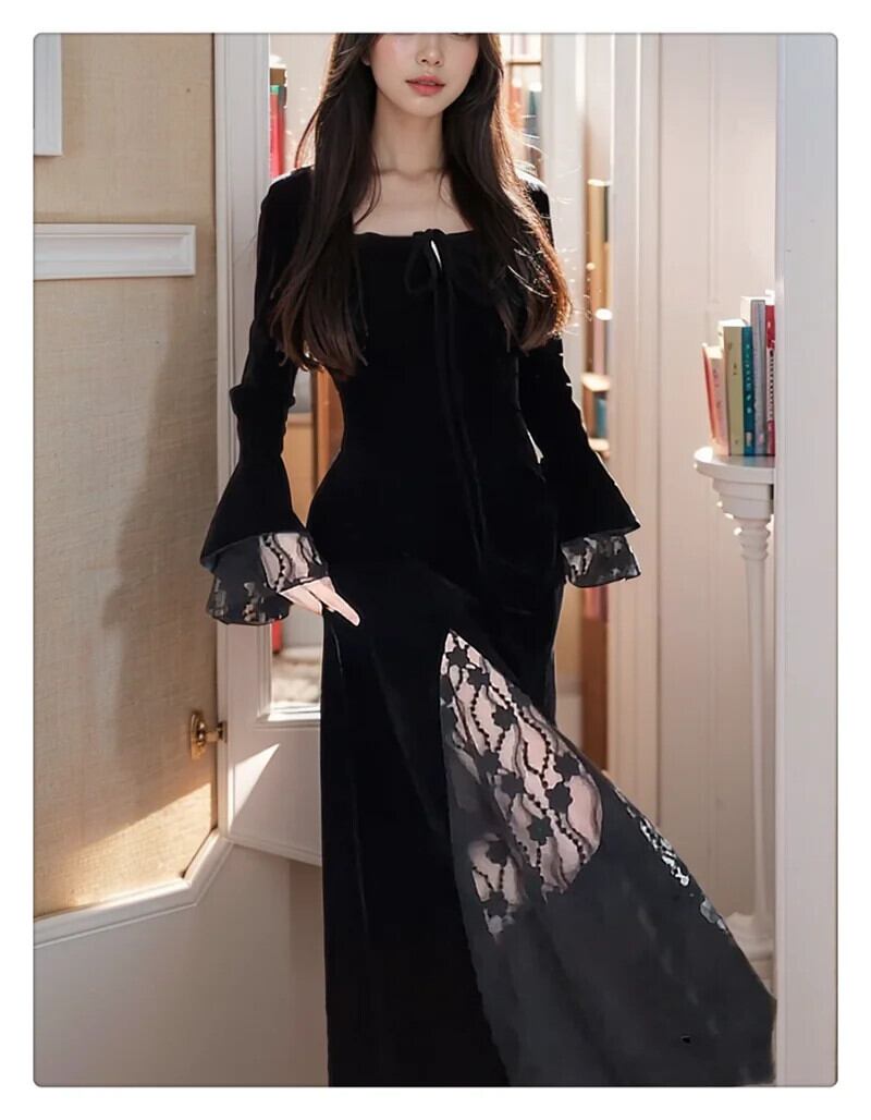 フレンチスウィートガールベルベットロングドレス秋/冬レーススプリットブラックホルターネックスリムフィットドレス 大人ガーリー キュート カジュアル オータム 秋物 ウィンター 冬物
