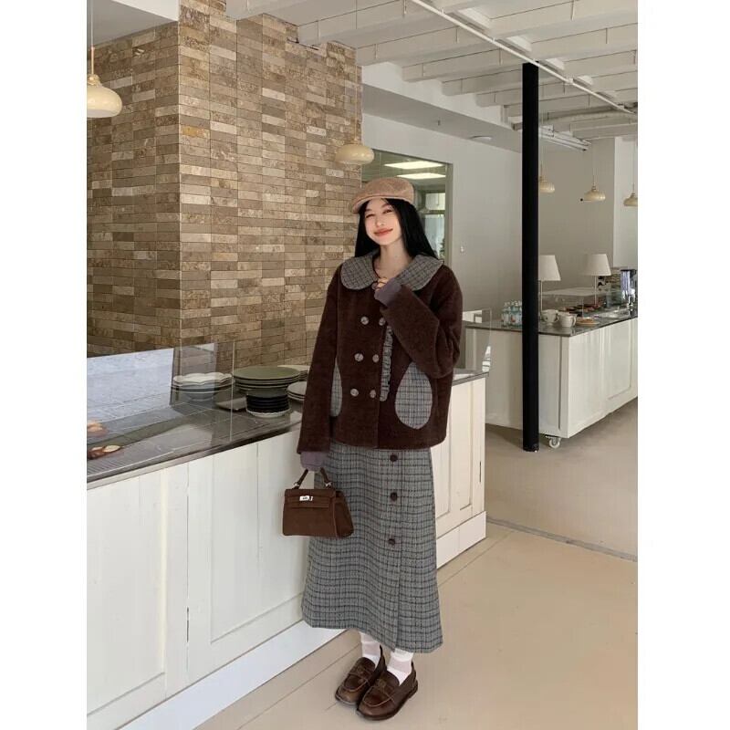 甘いホットガールスーツ冬ピーターパン襟ダブルブレストウールジャケットチェック柄スカートツーピースセット 大人ガーリー スウィート キュート カジュアル ウィンター 冬物