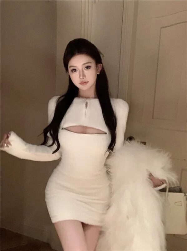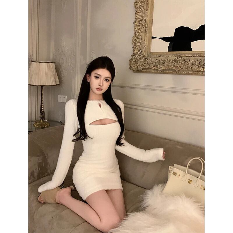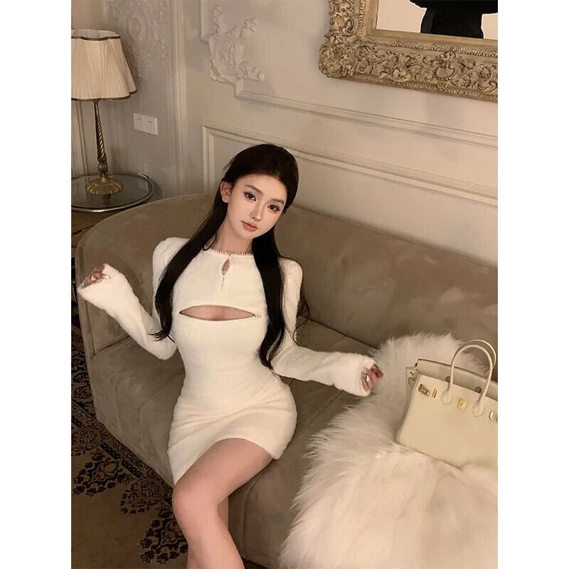 甘いホットガールセクシージッパーニットボトム長袖ドレス冬 O ネックスリムフィットドレス ロング 大人ガーリー スウィート キュート カジュアル ウィンター 冬物 Oネック