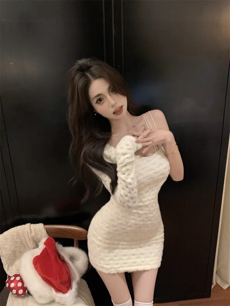 ホットガール不規則オフショルダーニットドレス秋/冬純粋セクシースリム弾性ラップヒップショートドレス エラスティック 伸縮 オータム 秋物 ウィンター 冬物 ピュア