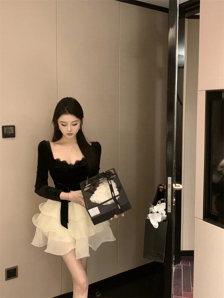 甘いホットガール黒ベルベットレースパッチワークドレス秋と冬ウエストスリムフィット花つぼみセクシーショートドレス ブラック 大人ガーリー スウィート キュート カジュアル オータム 秋物 ウィンター 冬物 フラワーデザイン