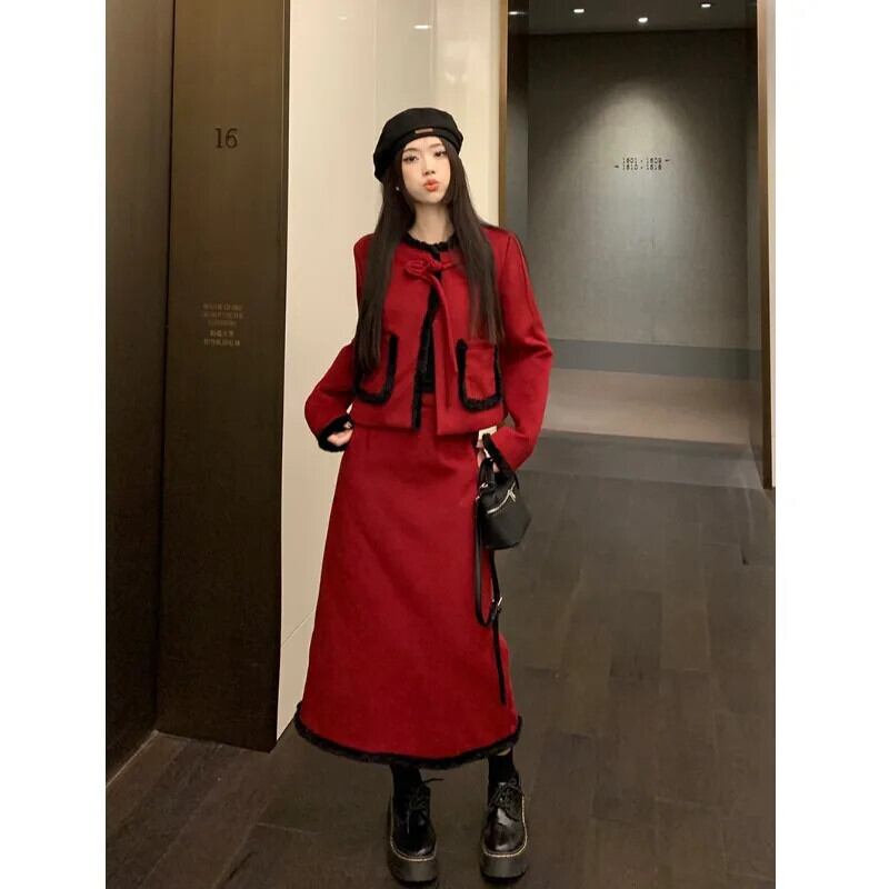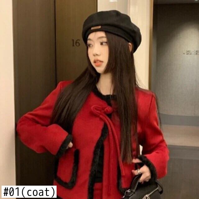 Sweet Girl スーツ レディース 秋と冬 レッド コットン フリース コート ウエスト ロング スカート 2 点セット 大人ガーリー スウィート キュート カジュアル オータム 秋物 ウィンター 冬物