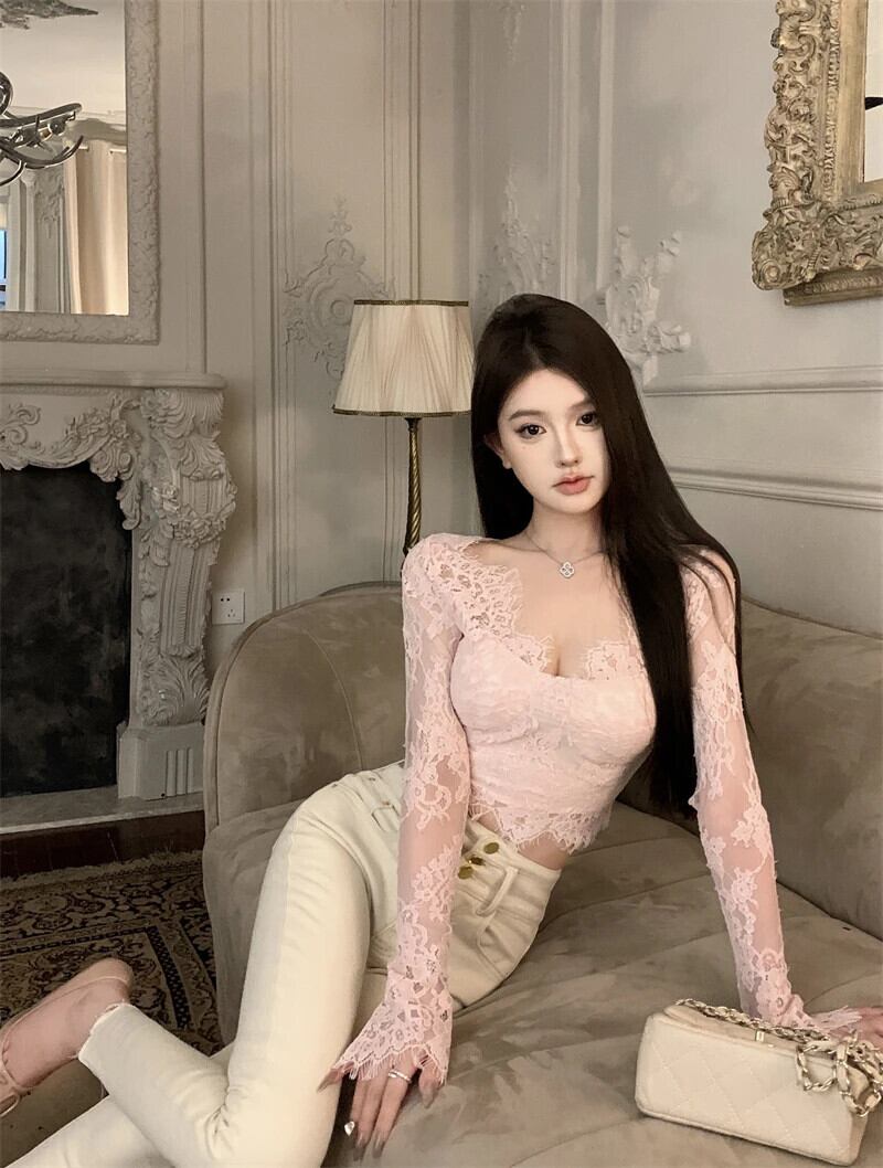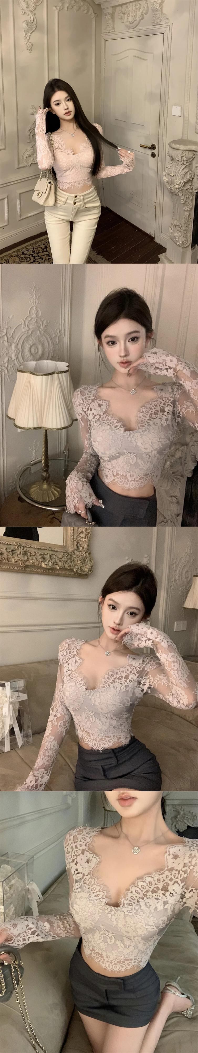 甘いホットガールレーススリムフィット Tシャツ秋と冬純粋セクシー V ネック長袖トップ ロング 大人ガーリー スウィート キュート カジュアル オータム 秋物 ウィンター 冬物 Vネック ピュア