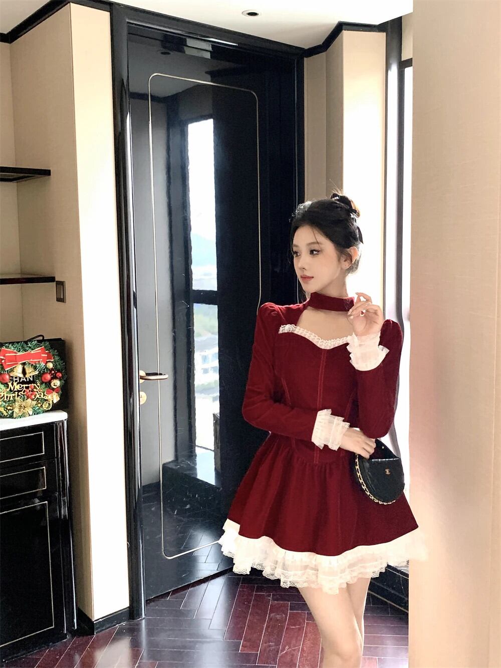 フレンチスウィートガールクリスマスホルターネック長袖ドレス冬スプライシングスクエアカラーAラインドレス ロング 大人ガーリー キュート カジュアル ウィンター 冬物 スクウェア