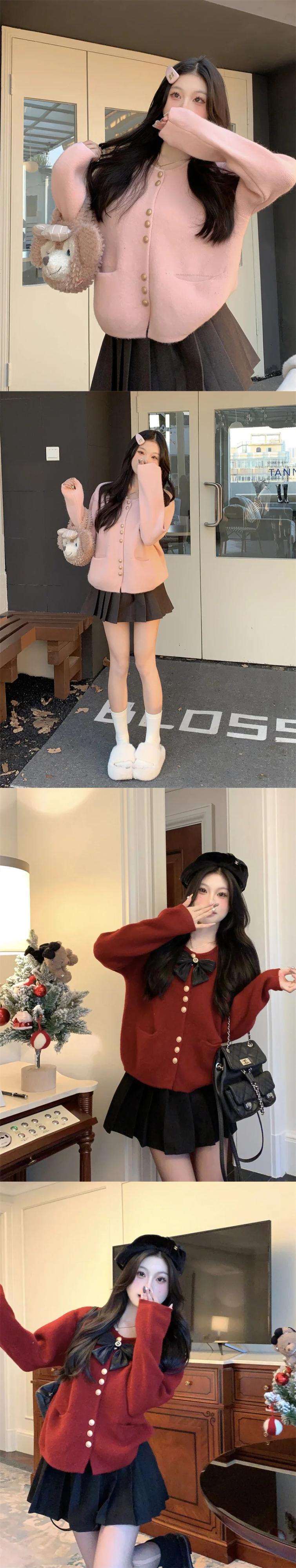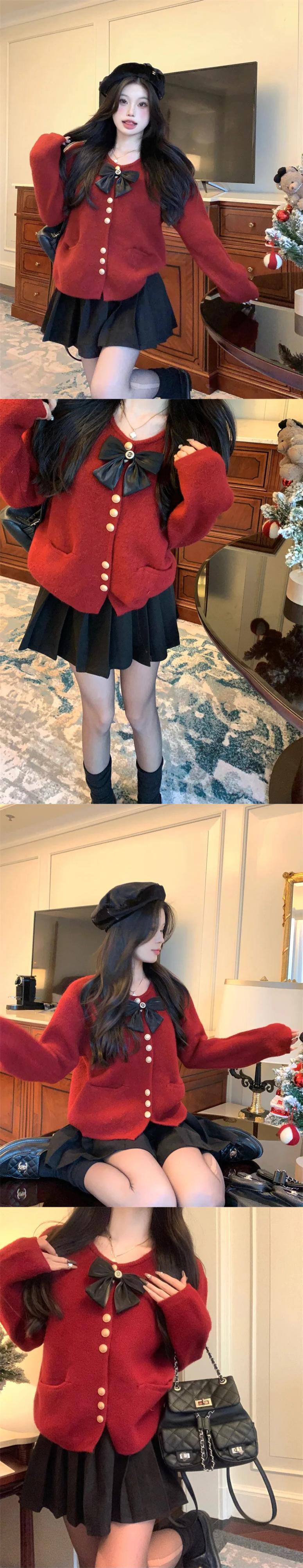 フレンチスウィートガールスーツ冬ルーズリボンニットカーディガンウエストミニスカートツーピースセット 大人ガーリー キュート カジュアル ウィンター 冬物