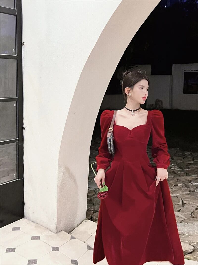 フレンチスウィートガールスクエアカラーベルベットドレス冬バブルスリーブスリムフィットAラインロングドレス 大人ガーリー キュート カジュアル ウィンター 冬物 スクウェア