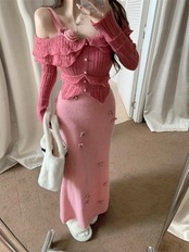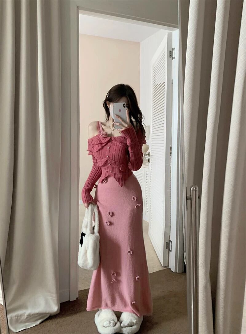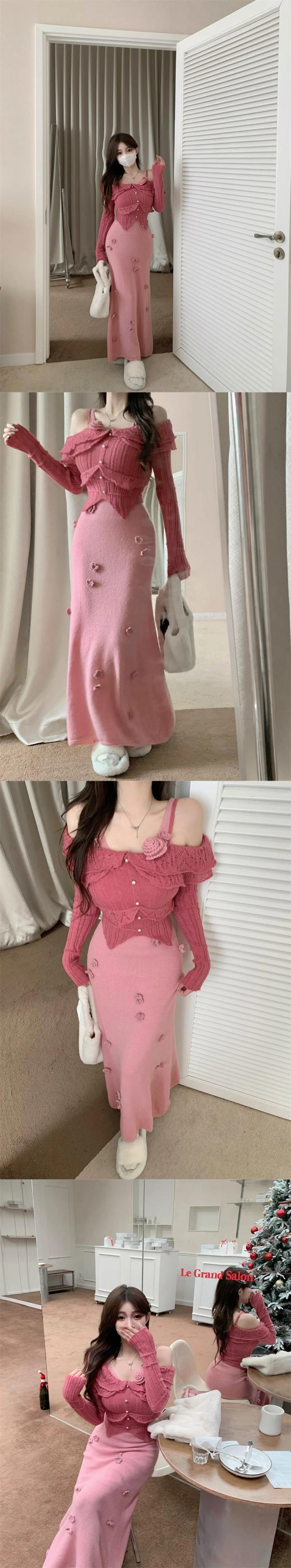 甘いホットガールスーツ秋/冬スラッシュネックセーター 3D ローズニットドレスツーピースセット 大人ガーリー スウィート キュート カジュアル オータム 秋物 ウィンター 冬物