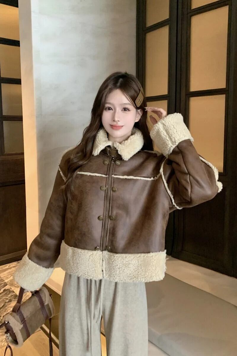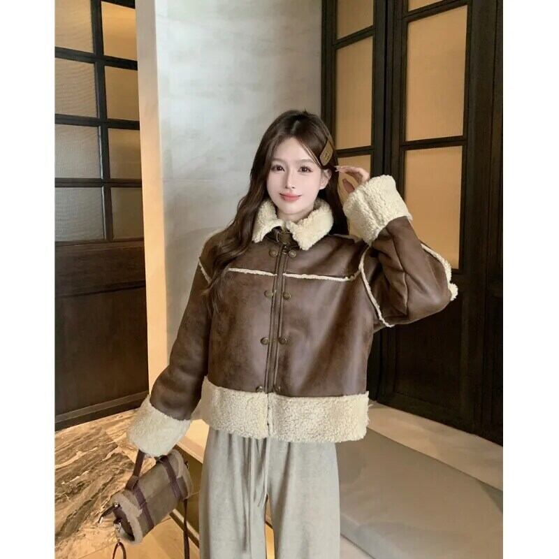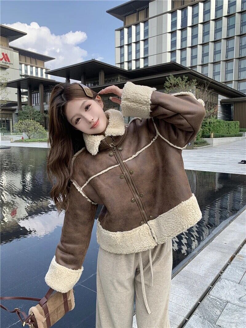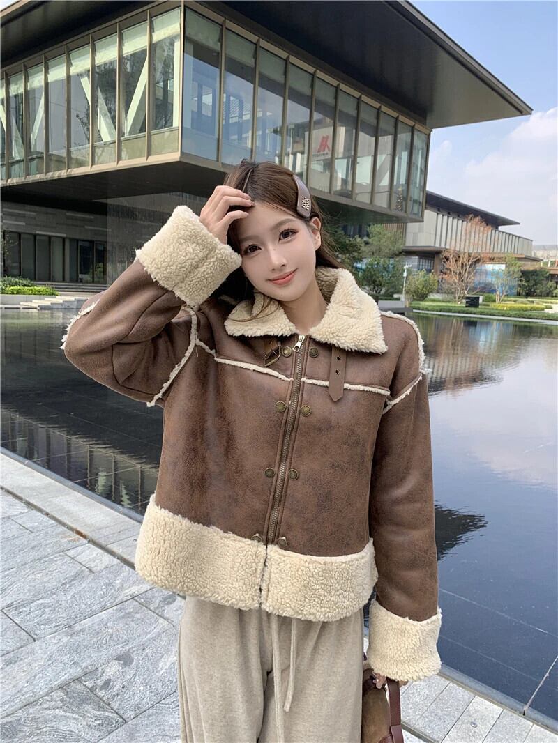 メイラードスタイルホットガール肥厚ラムウールジャケット冬レトロルースターンダウン襟スエードジャケット スウェード ウィンター 冬物