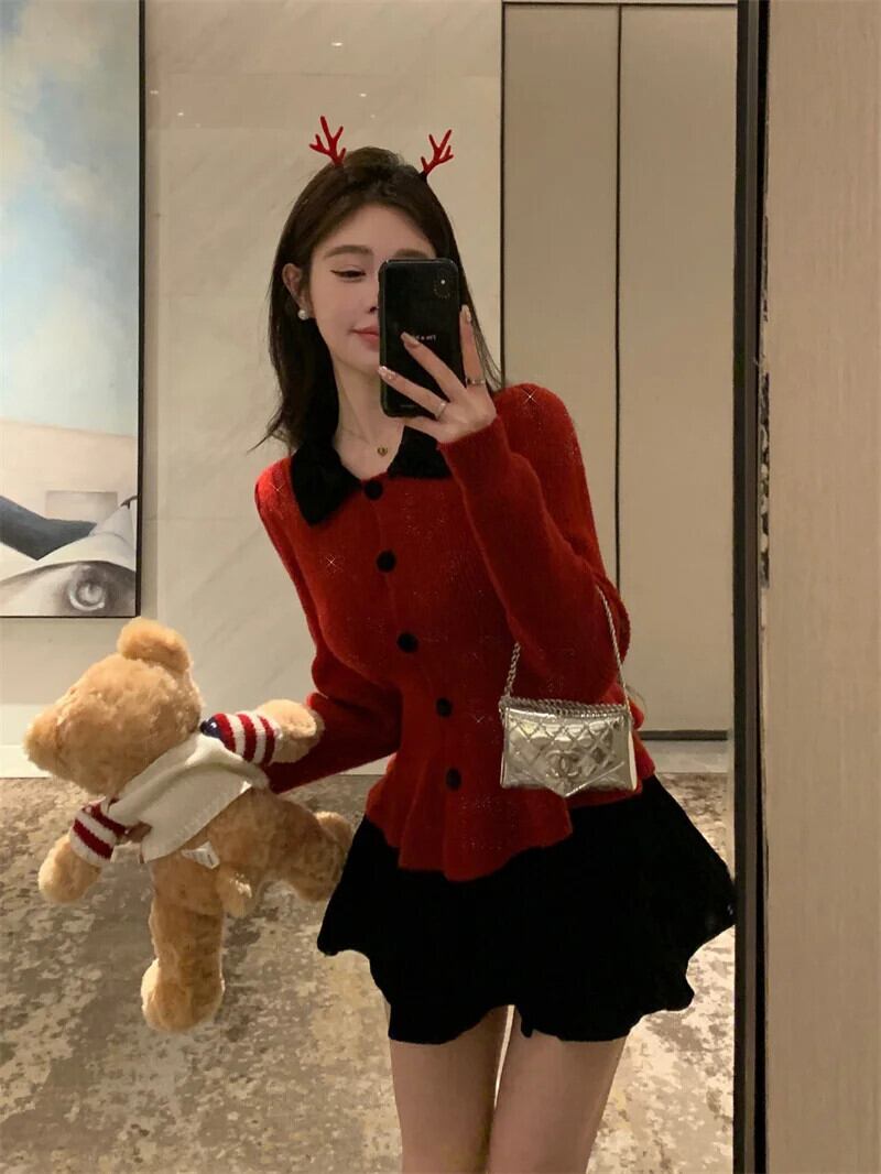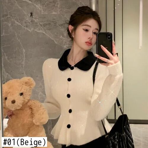 甘いホットガールピーターパン襟ニットカーディガン冬パッチワークフラワースリムフィットセータージャケット 大人ガーリー スウィート キュート カジュアル ウィンター 冬物 シルク フラワーデザイン