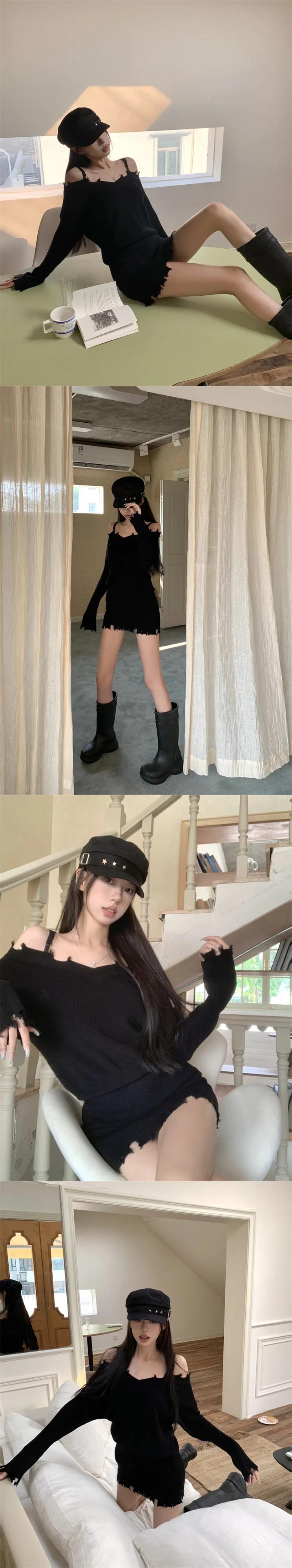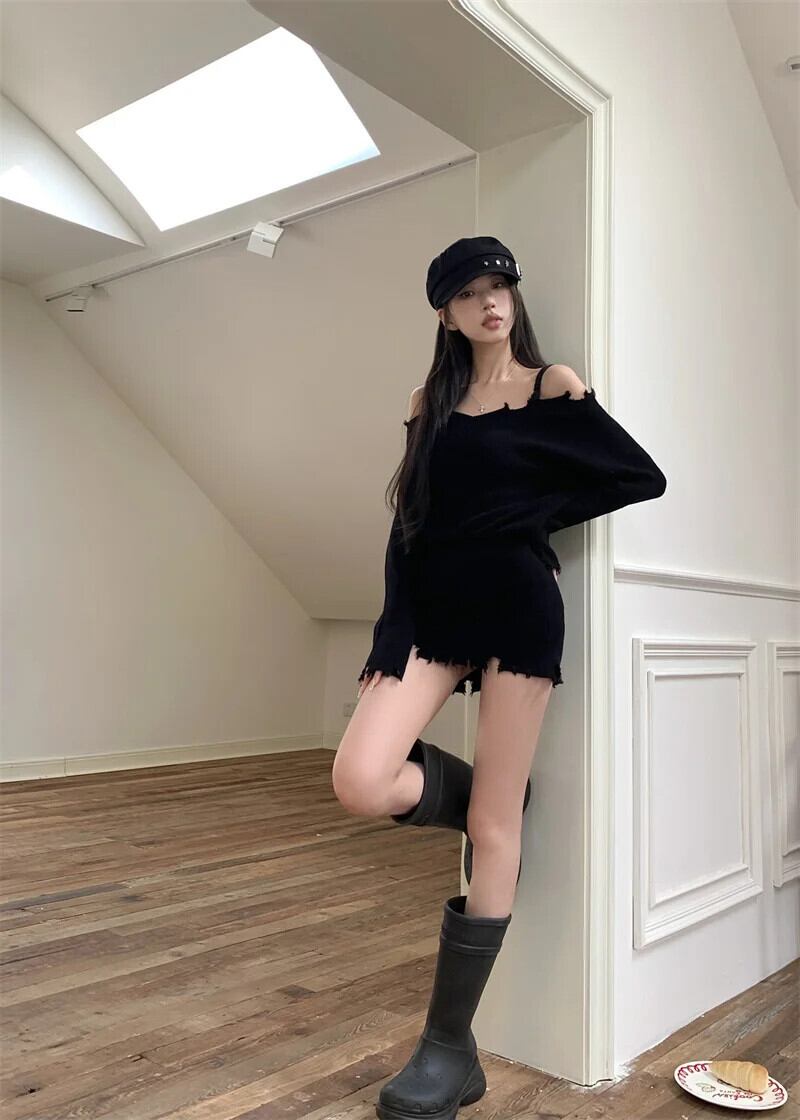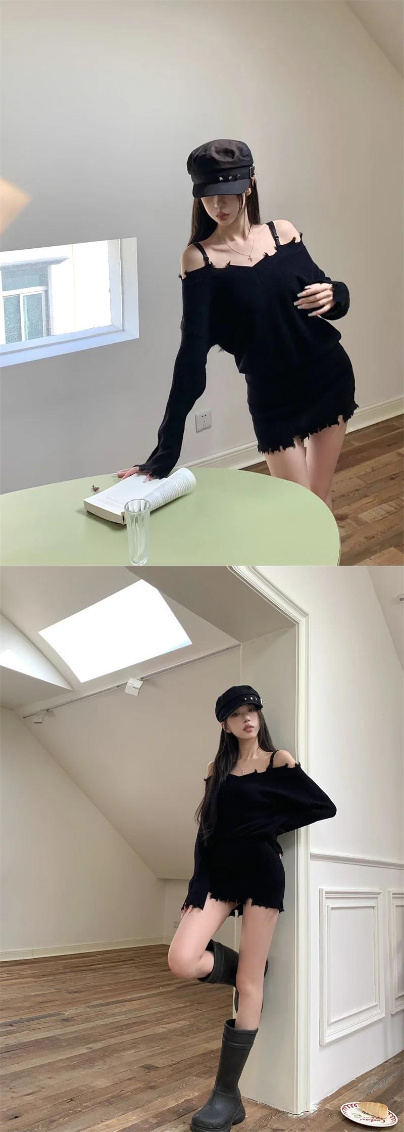 スウィートガールオフショルダー V ネックストラップニットドレス冬スリムフィット長袖ラップヒップショートドレス ロング 大人ガーリー キュート カジュアル ウィンター 冬物 Vネック