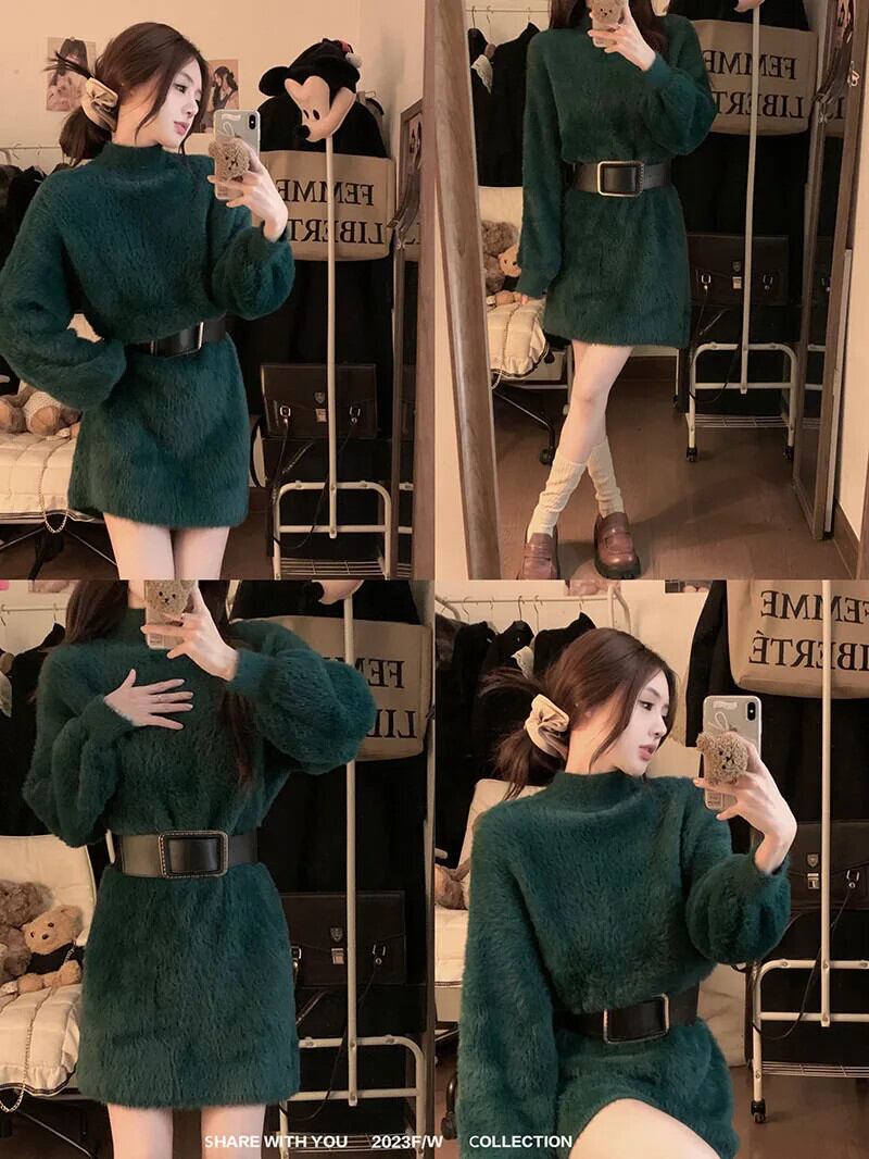 甘いホットガールハーフネックニットドレス冬毛皮ようスリムフィット A ラインショートドレス 大人ガーリー スウィート キュート カジュアル ウィンター 冬物 Aライン