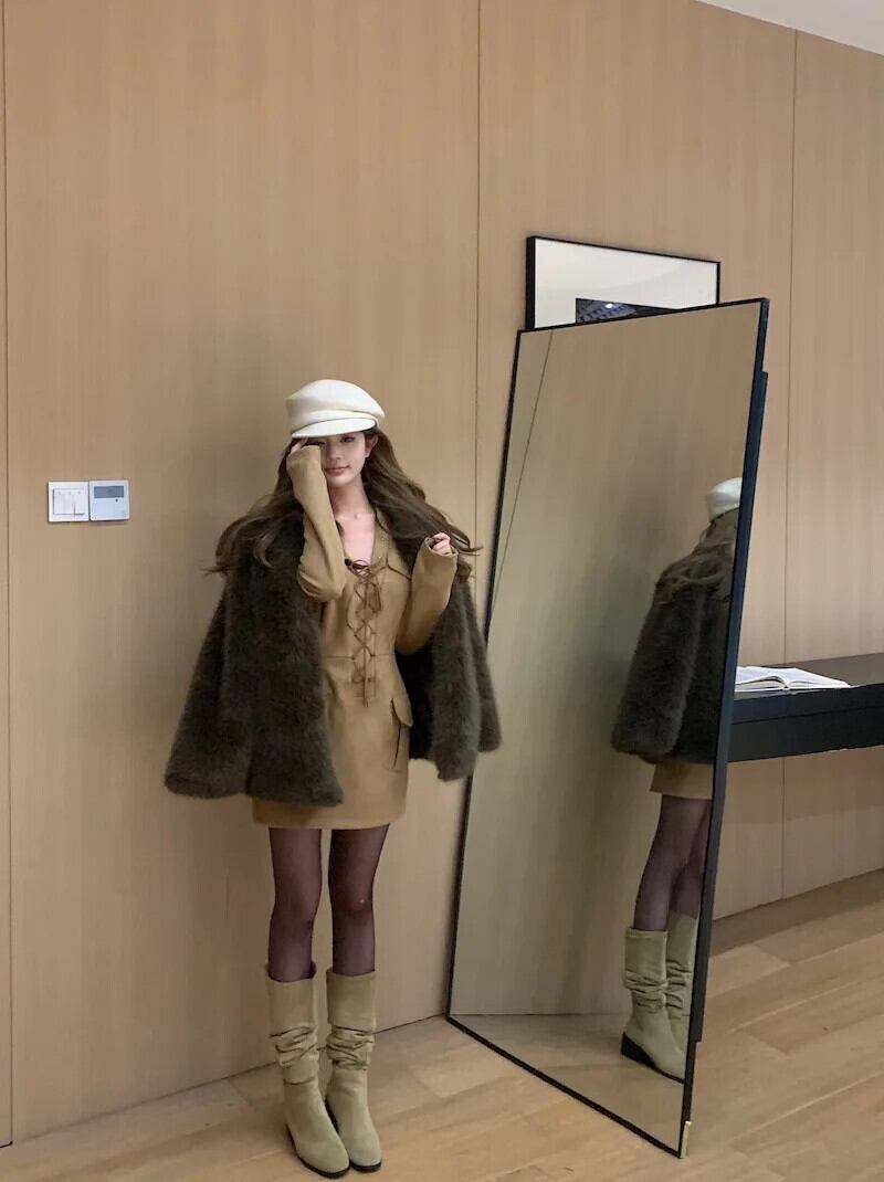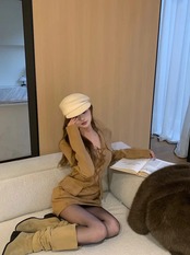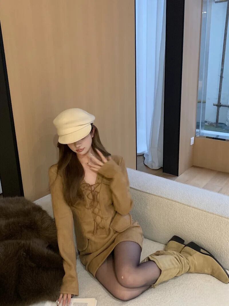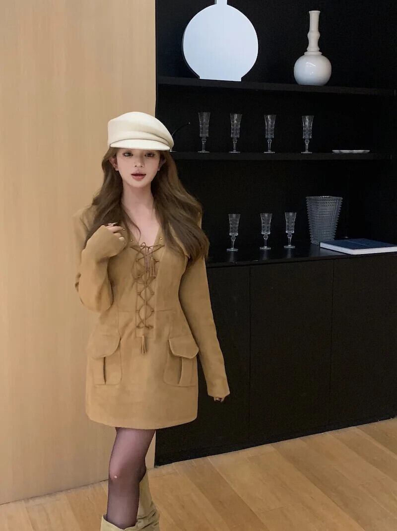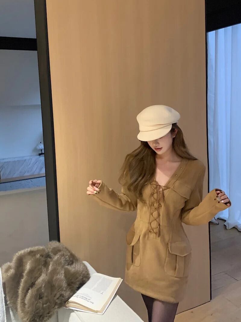 Sweet Girl スリムフィットボトム長袖ドレス秋/冬メイラードスタイル V ネックラップヒップショートスカート ロング 大人ガーリー スウィート キュート カジュアル オータム 秋物 ウィンター 冬物 Vネック