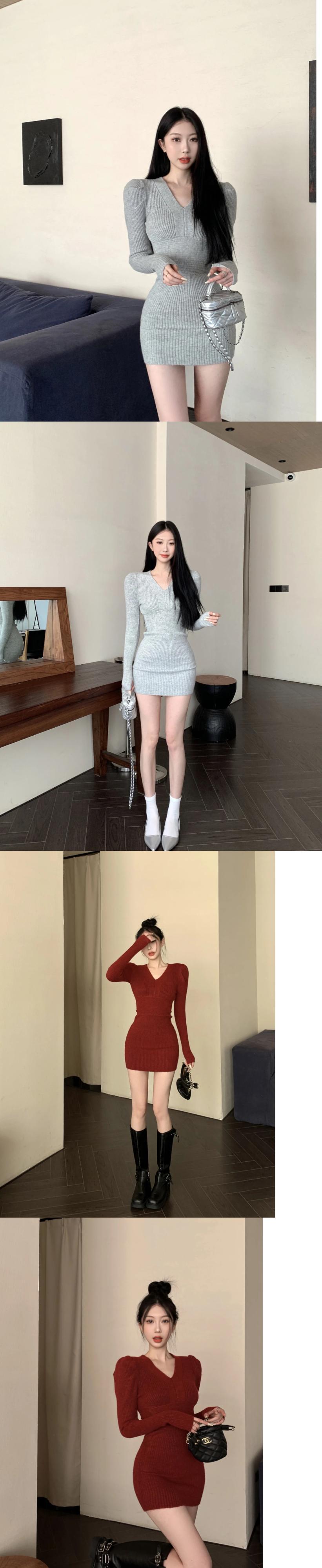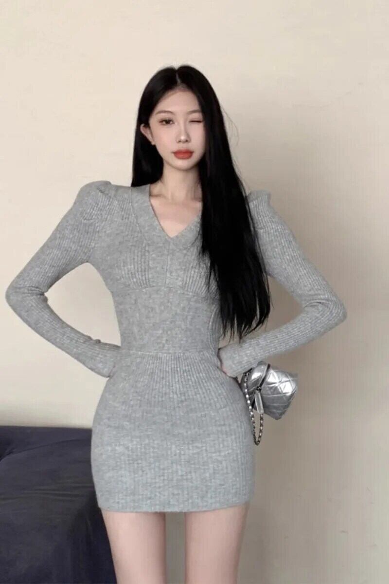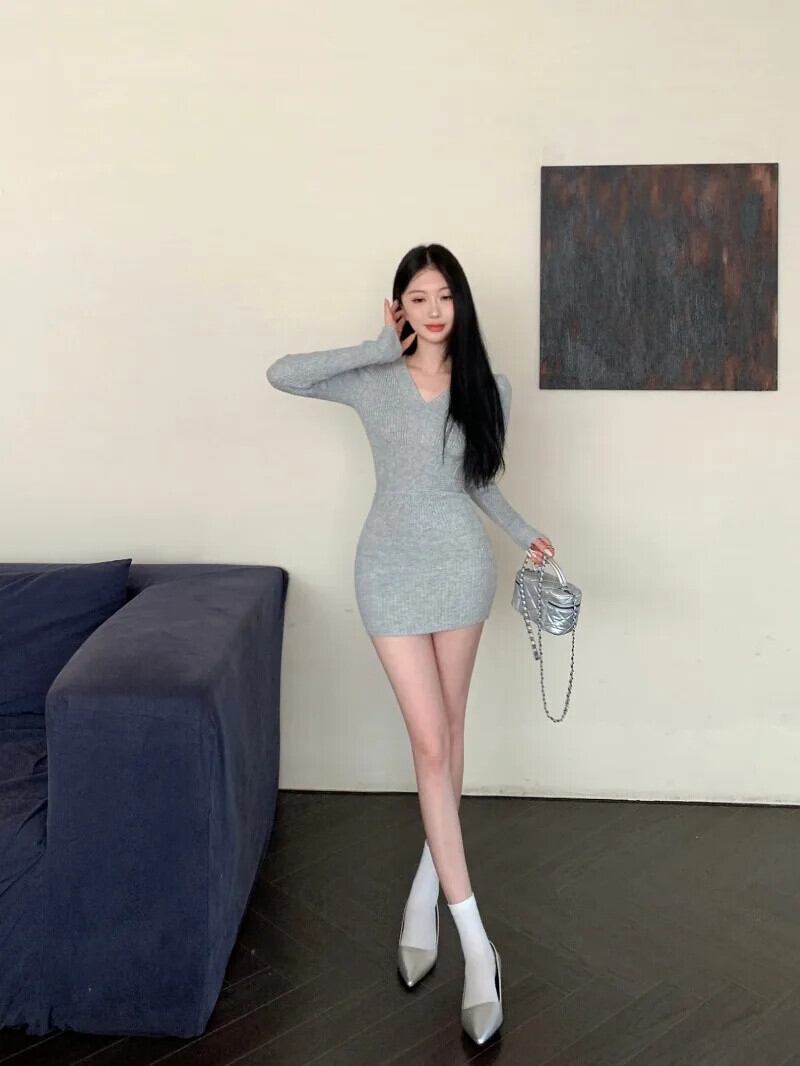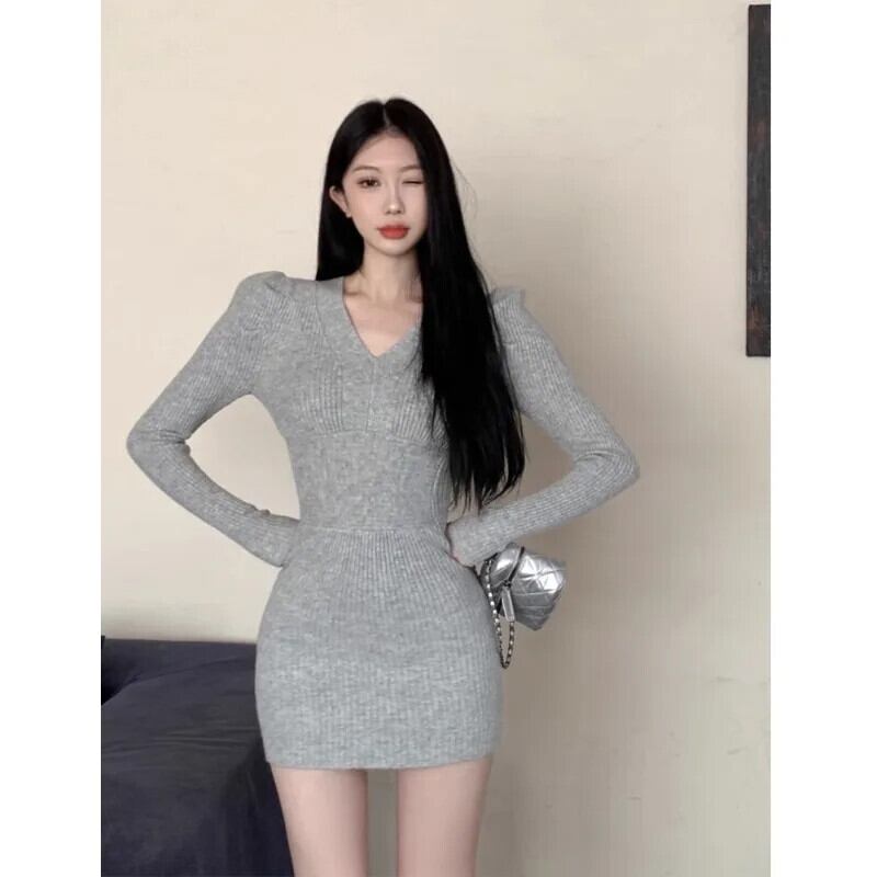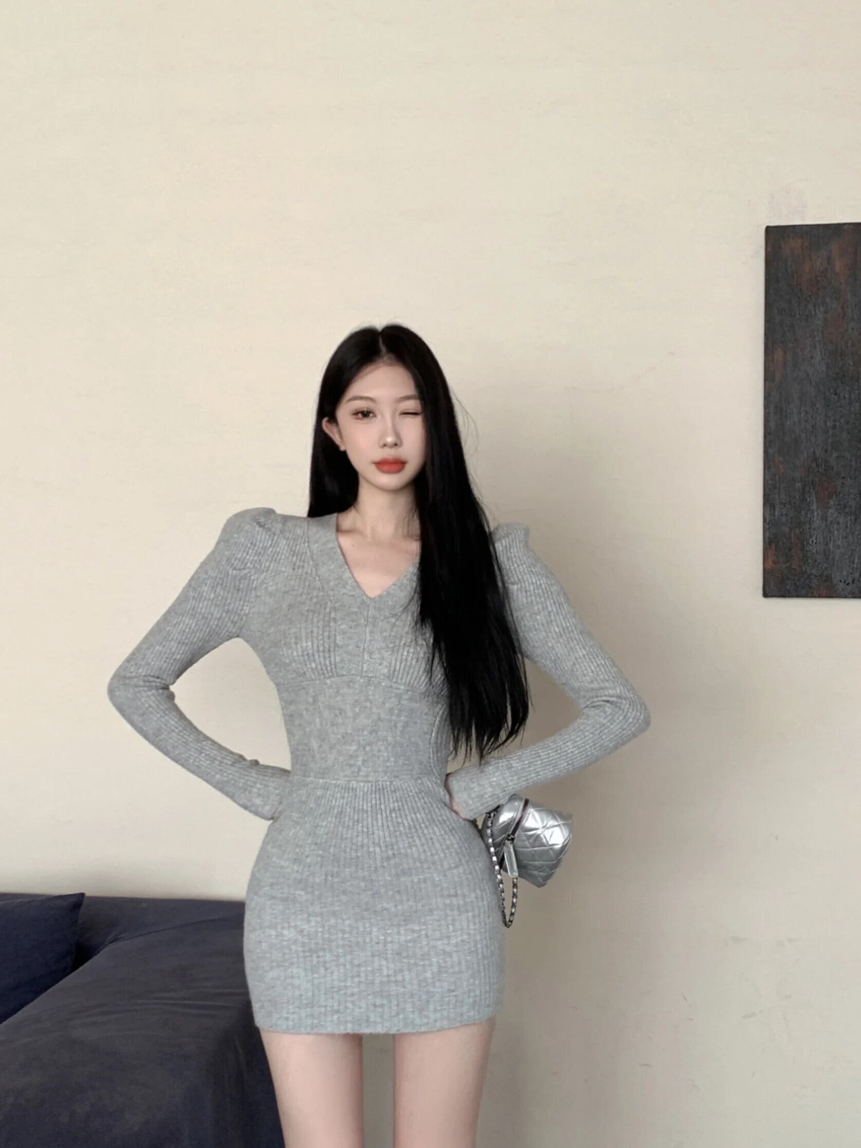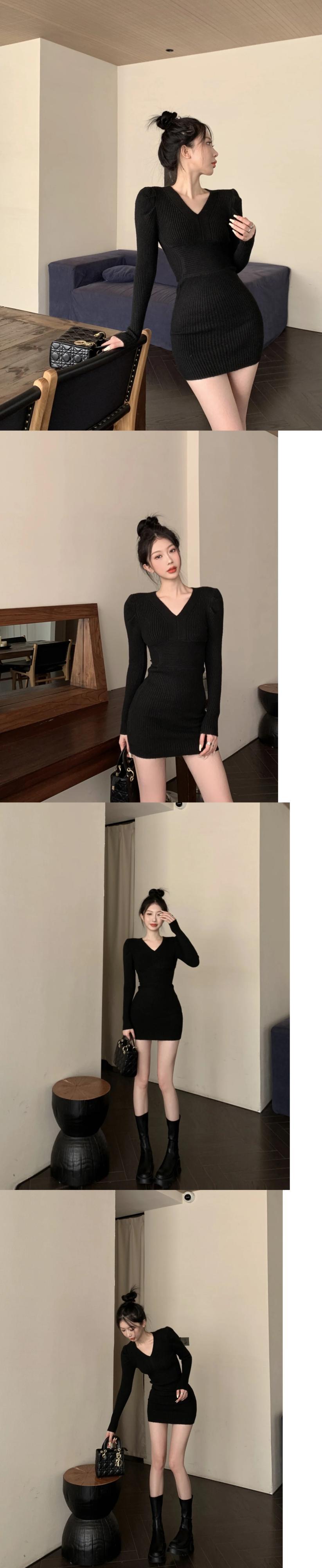 甘いホットガールレトロスリムフィット V ネックドレス秋/冬純粋セクシー長袖ショートドレス ロング 大人ガーリー スウィート キュート カジュアル オータム 秋物 ウィンター 冬物 Vネック ピュア