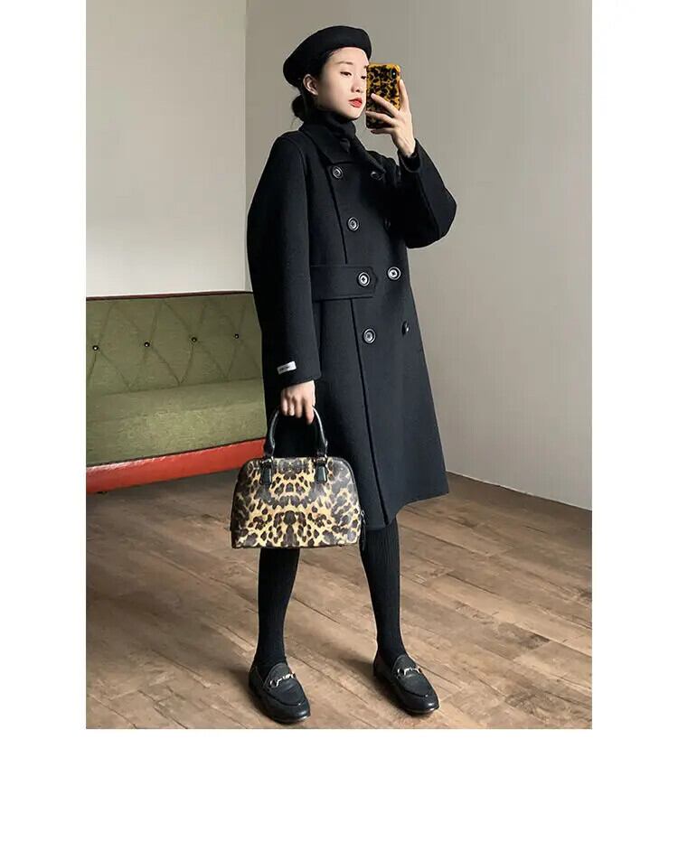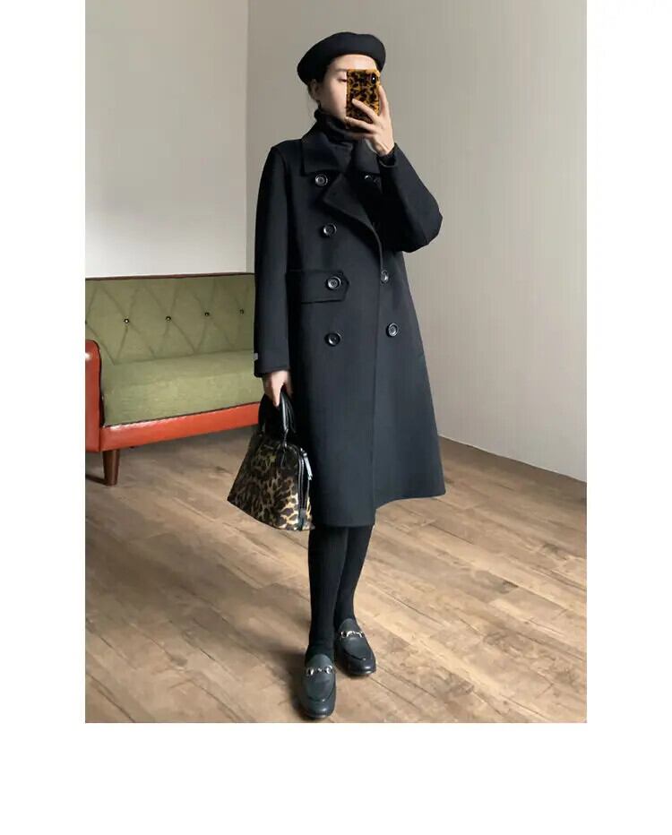 甘いホットガールダブルブレスト黒ウールコート秋/冬ルーズフィットミディアム丈ウールコート ブラック 大人ガーリー スウィート キュート カジュアル オータム 秋物 ウィンター 冬物