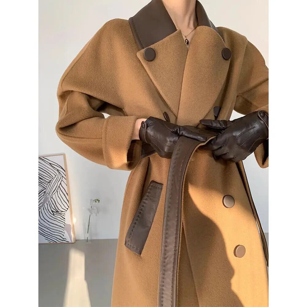 甘いホットガール Pu レザーパッチワークウールコート秋と冬ラペルレースアップルーズジャケット 大人ガーリー スウィート キュート カジュアル オータム 秋物 ウィンター 冬物