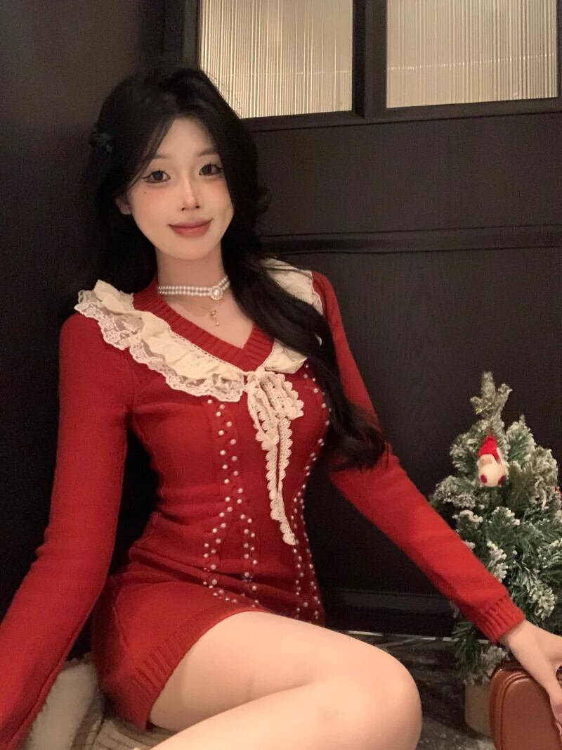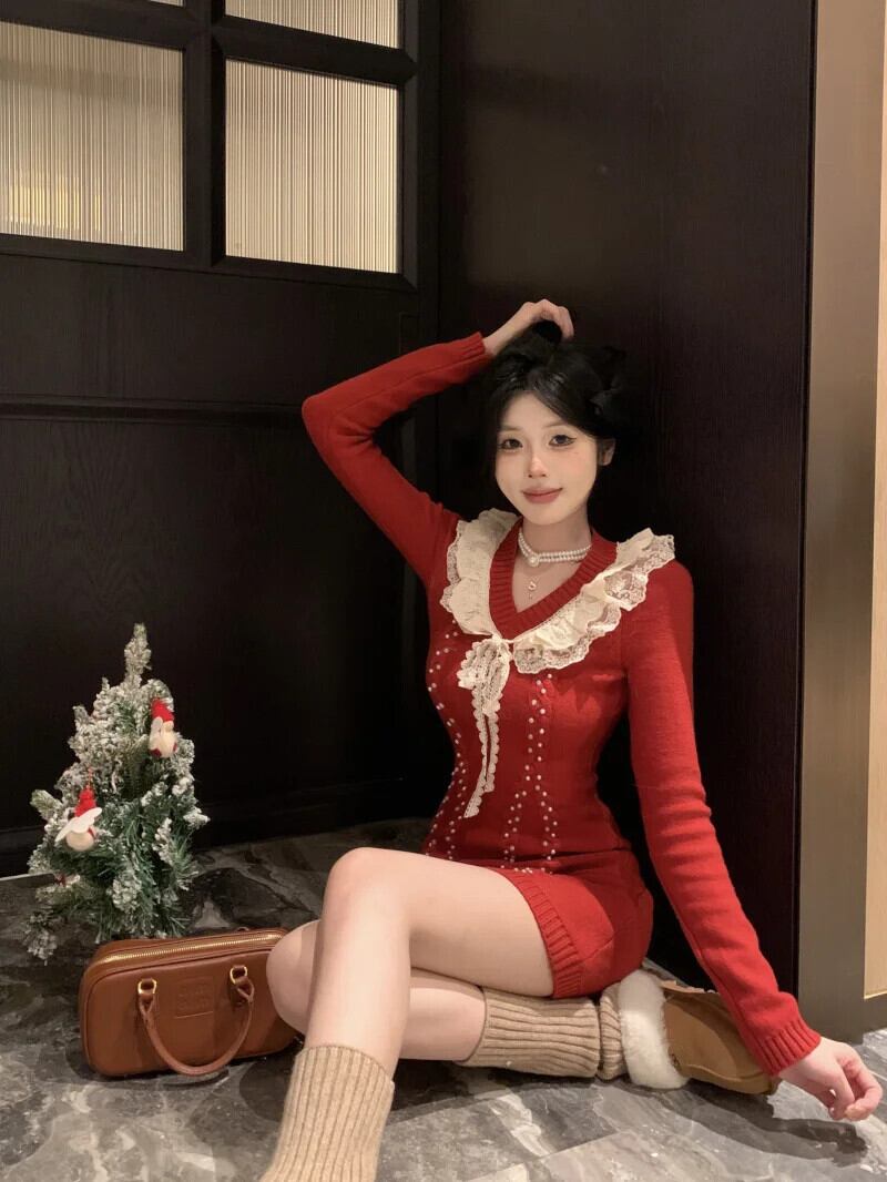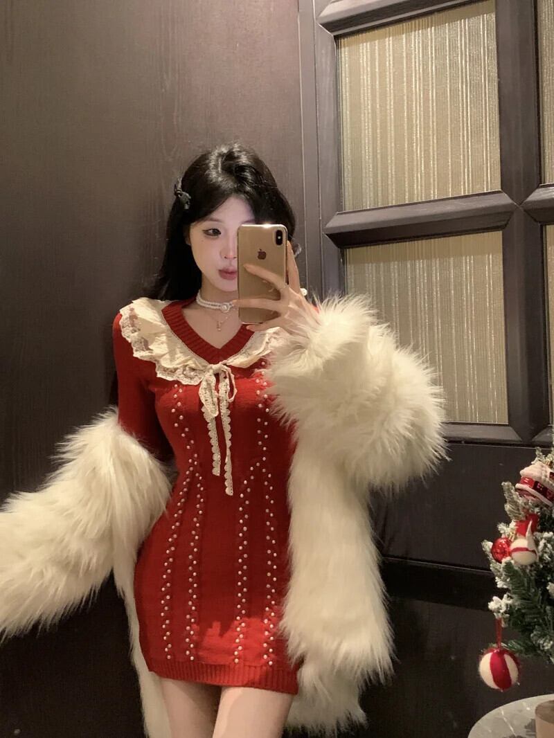 甘いホットガールビーズ V ネックニットドレス冬クリスマスレースヒップラップショートドレス 大人ガーリー スウィート キュート カジュアル ウィンター 冬物 Vネック