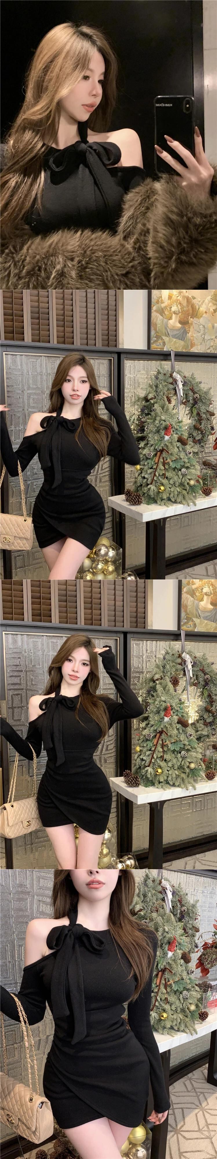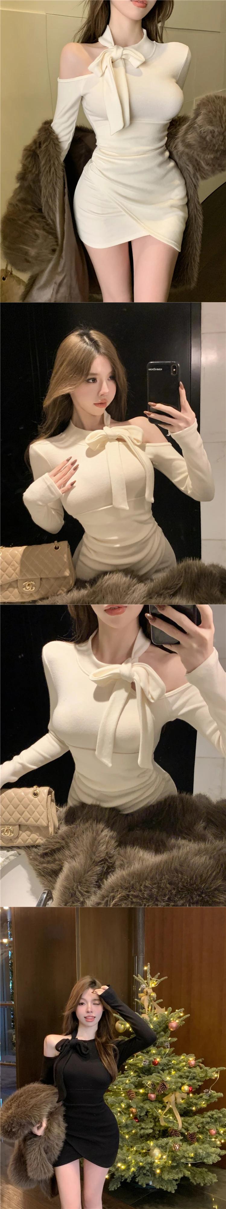 ホットガール純粋セクシー弓ドレス冬スリムフィットオフショルダー不規則ラップヒップドレス リボン ウィンター 冬物 ピュア