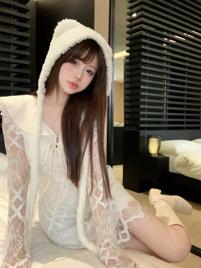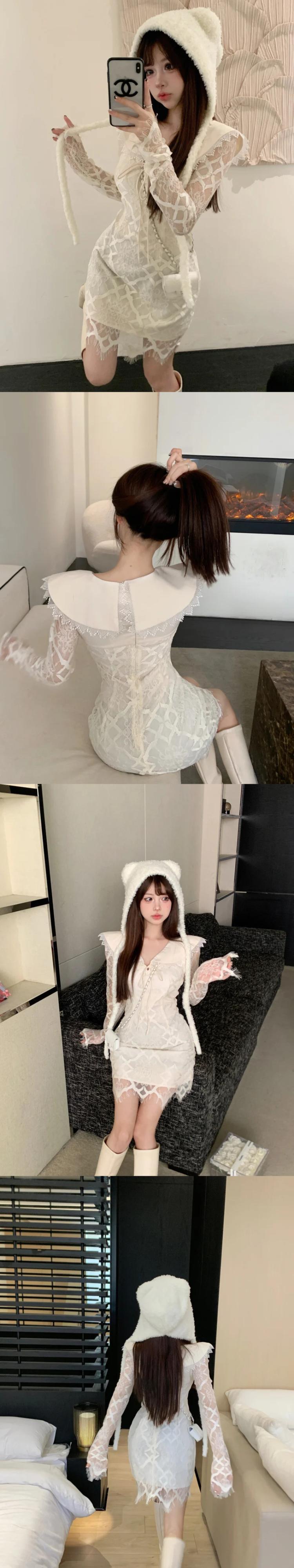 甘いホットガール純粋セクシーレース長袖ドレス冬ピーターパン襟スリムフィットラップヒップショートドレス ロング 大人ガーリー スウィート キュート カジュアル ウィンター 冬物 ピュア