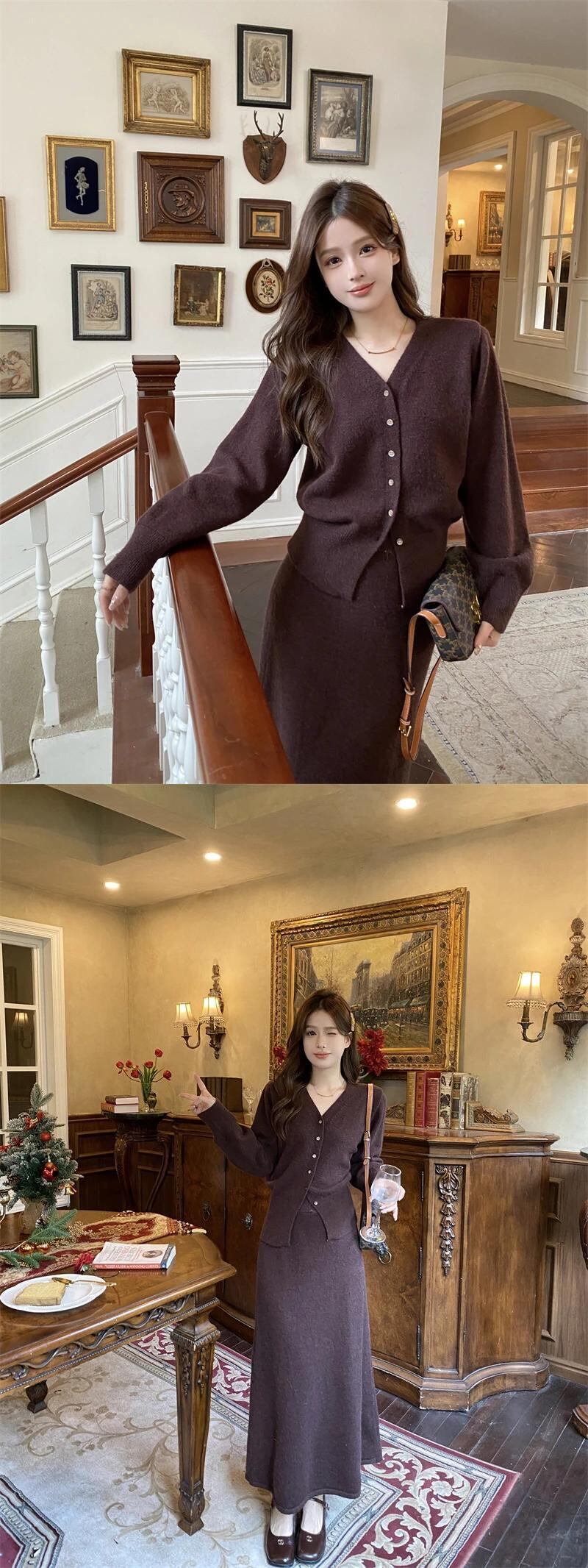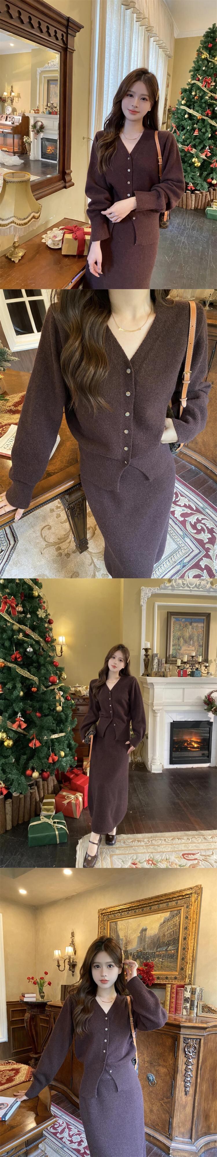 スイートガールスーツ冬ソリッド V ネックセーターコート弾性ウエスト A ラインロングスカート 2 点セット エラスティック 伸縮 大人ガーリー スウィート キュート カジュアル ウィンター 冬物 Vネック Aライン ソリッドカラー