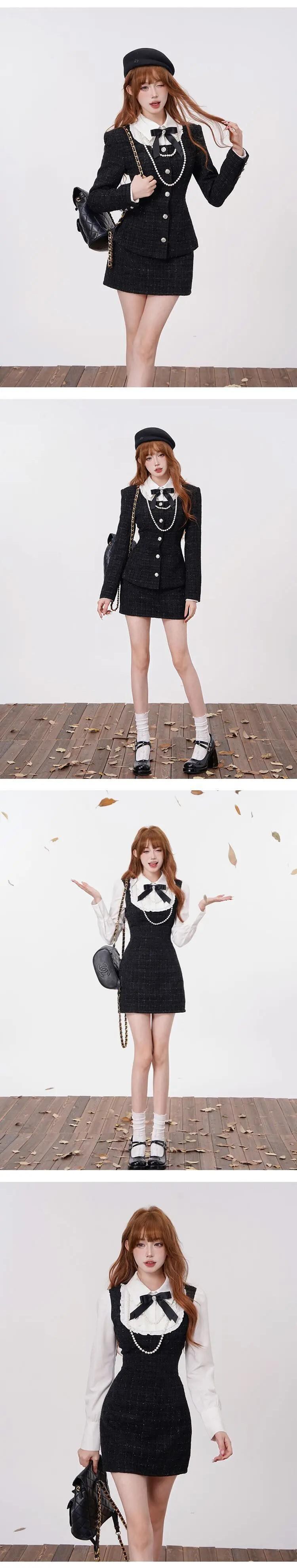 フレンチスイートホットガールスーツ秋/冬リボンスプライシングショートドレススクエアカラーコートツーピースセット 大人ガーリー スウィート キュート カジュアル オータム 秋物 ウィンター 冬物 スクウェア