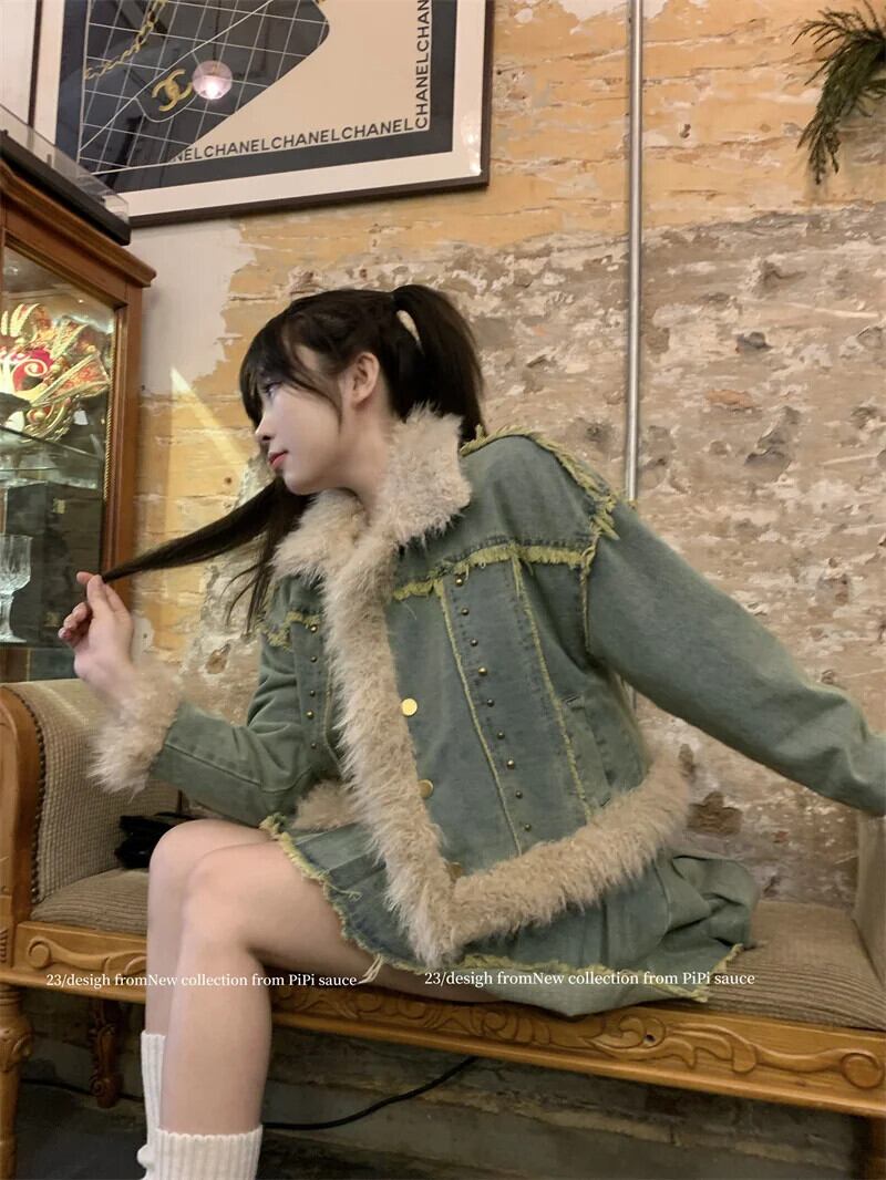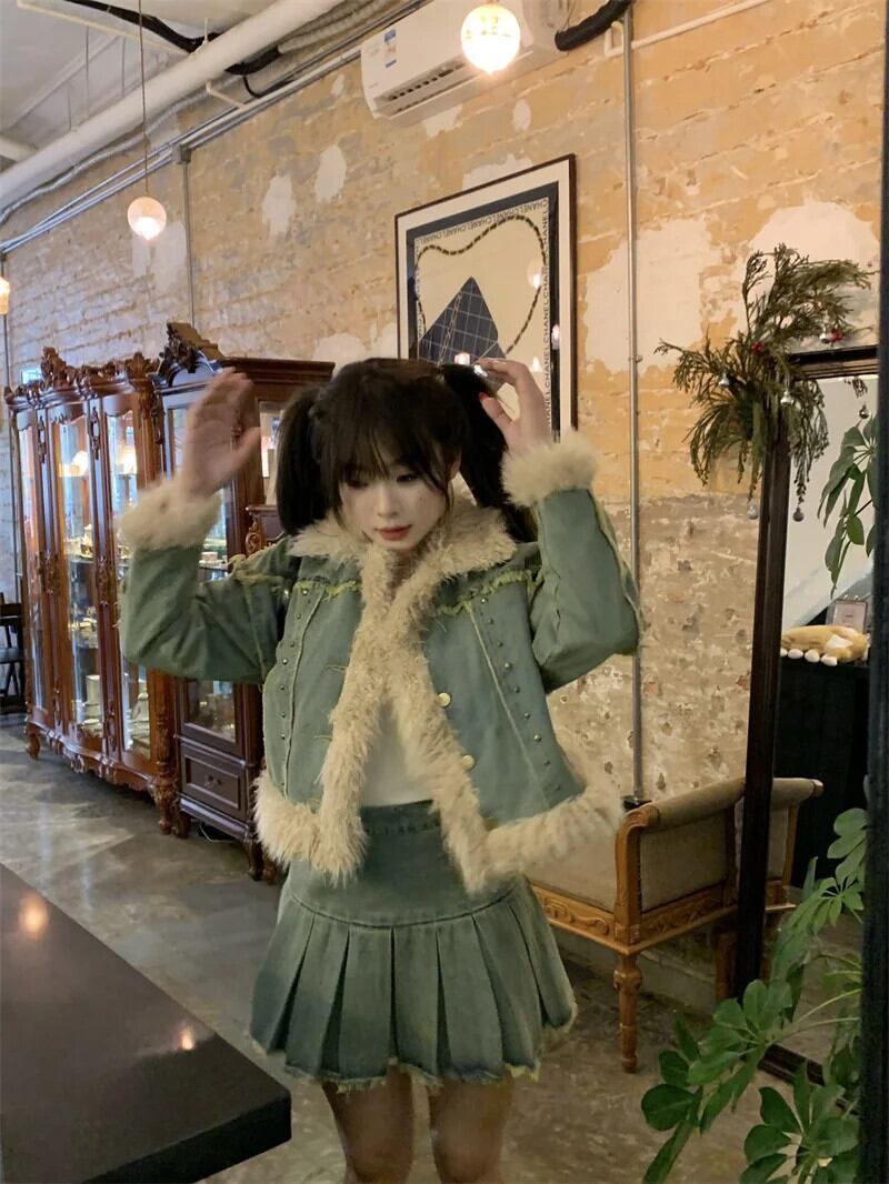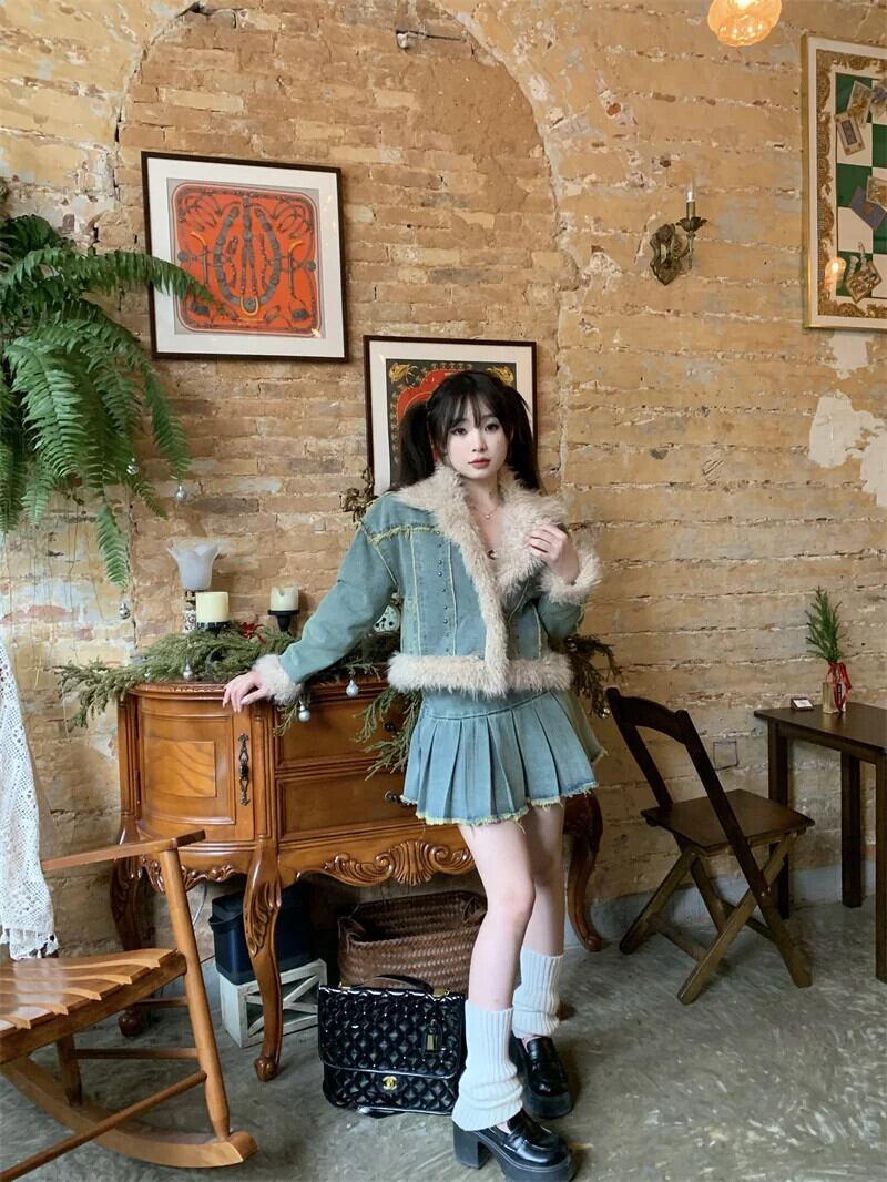 スイートガールスーツ冬豪華パッチワークデニムジャケットウエストテル A ラインスカート 2 点セット 大人ガーリー スウィート キュート カジュアル ウィンター 冬物 Aライン