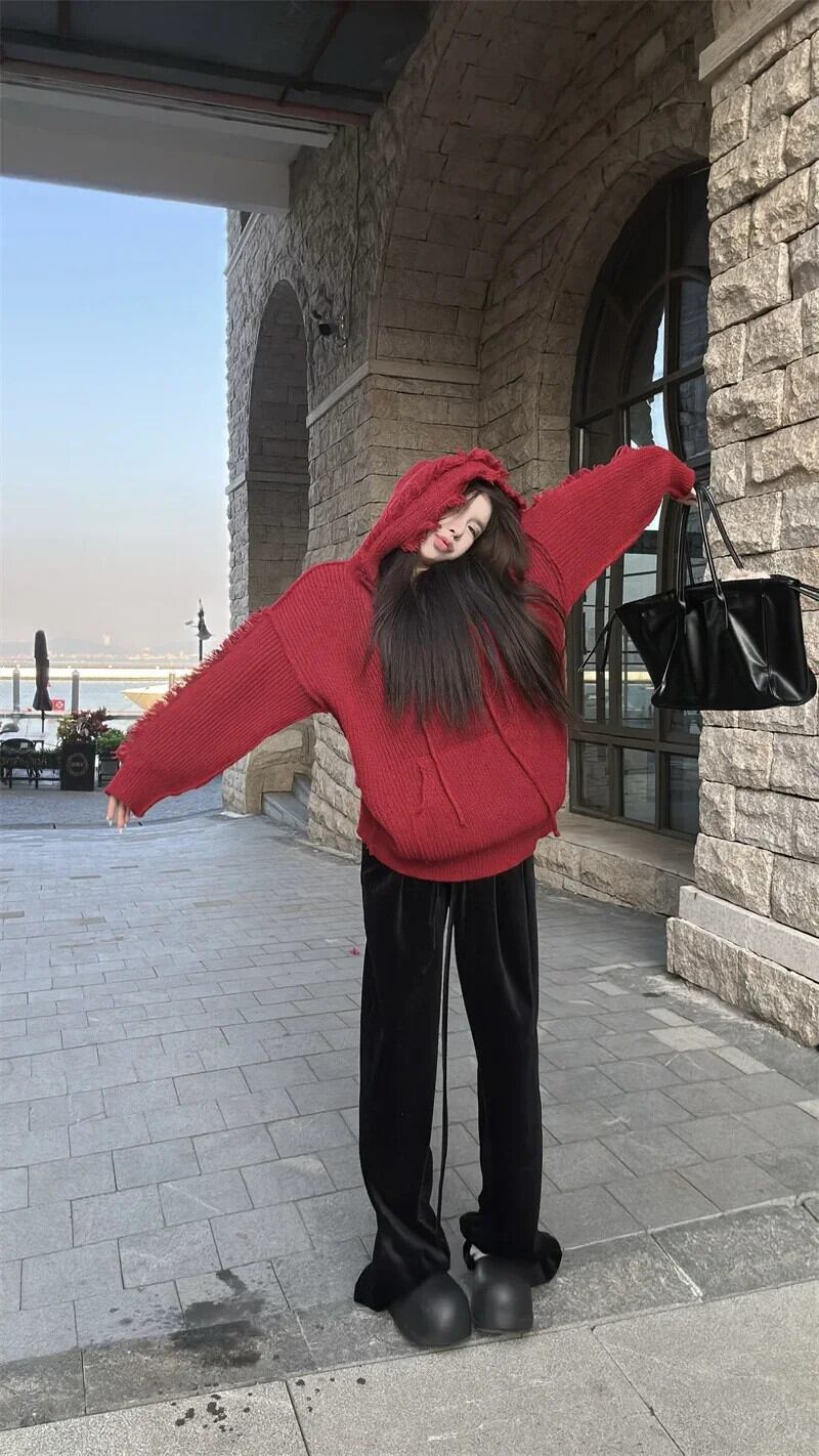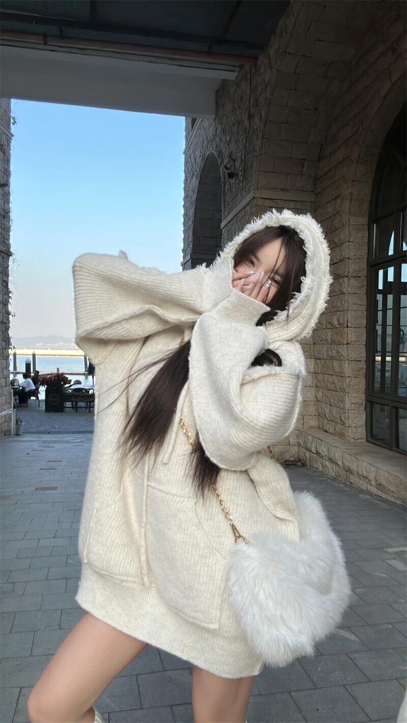 Sweet Girl 厚いフード付きセーター秋/冬ルーズ長袖ニットプルオーバー ロング 大人ガーリー スウィート キュート カジュアル オータム 秋物 ウィンター 冬物