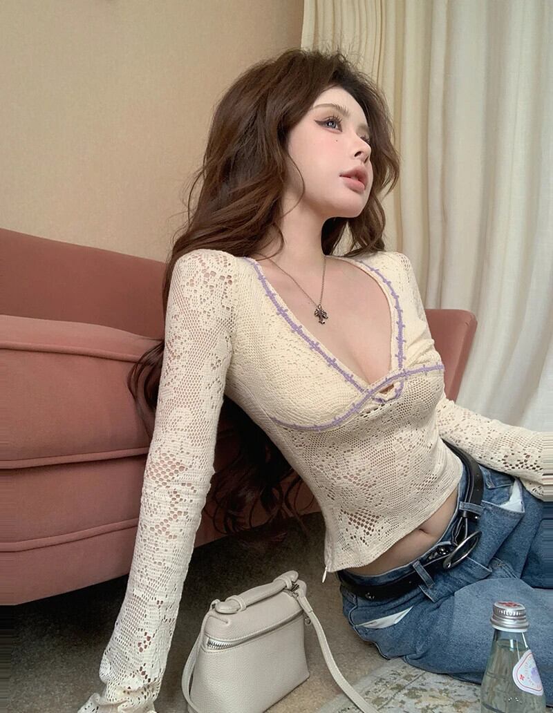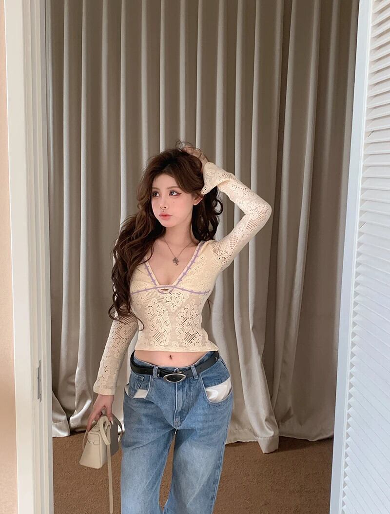 甘いホットガール純粋セクシーレースフックニットフラワーシャツ冬セクシースリムフィットプルオーバートップ 大人ガーリー スウィート キュート カジュアル ウィンター 冬物 ピュア フラワーデザイン