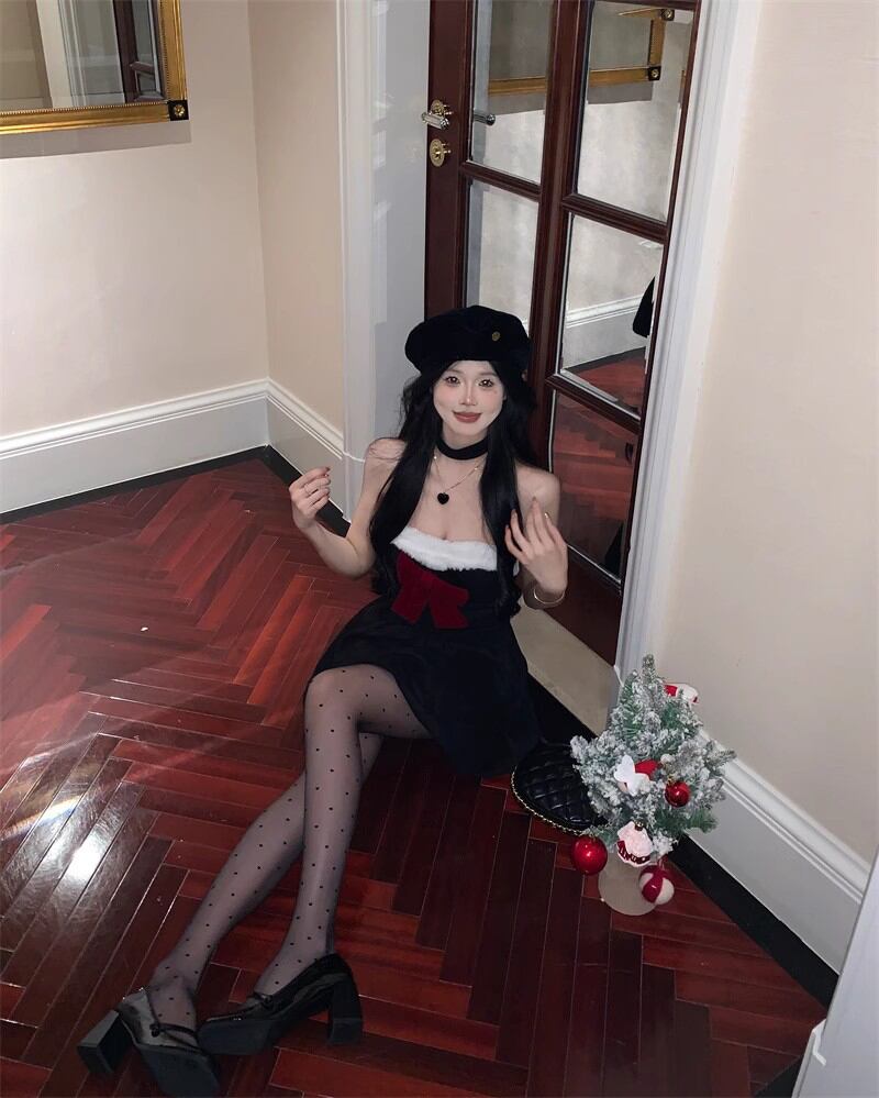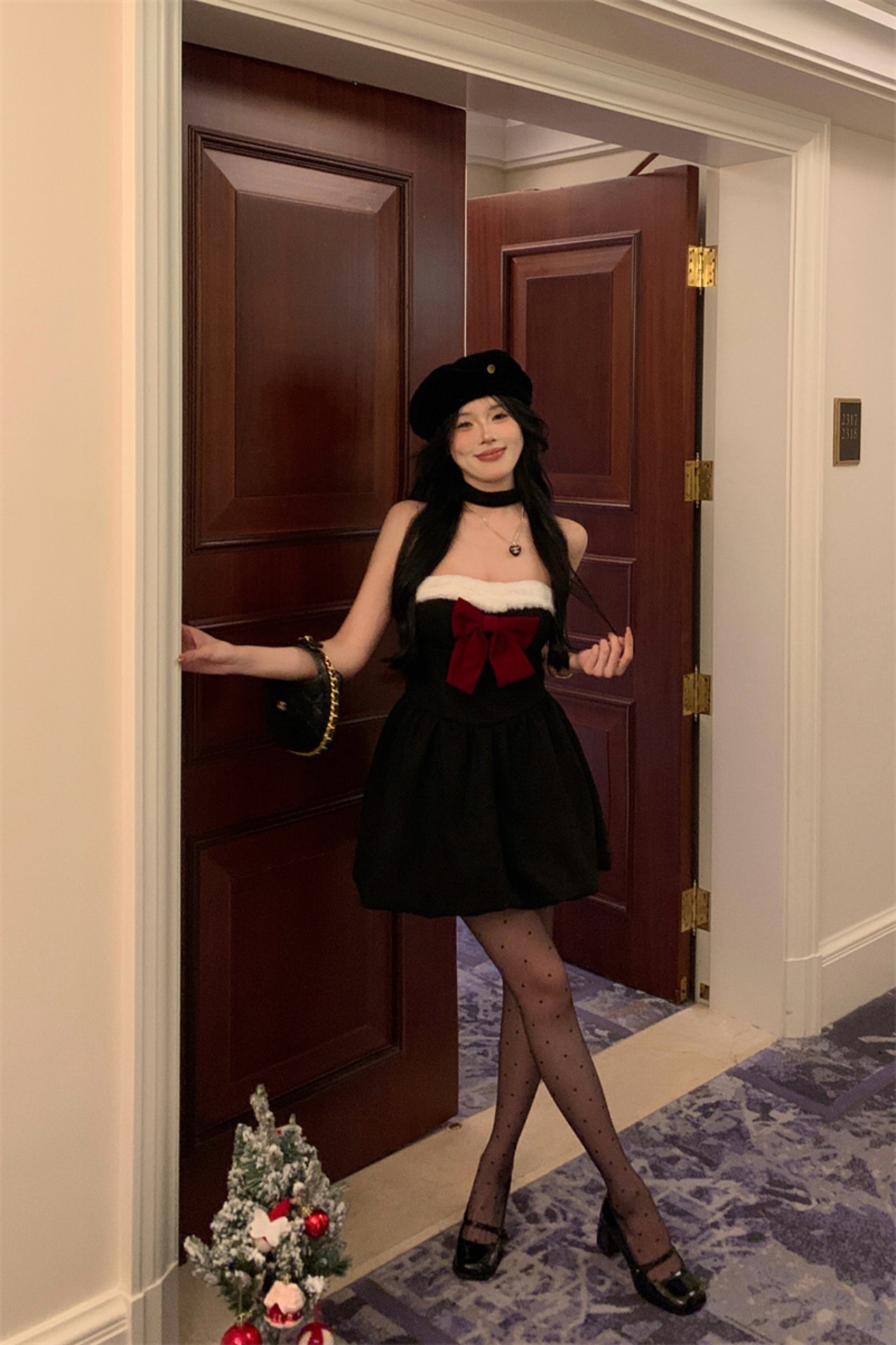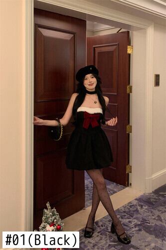 甘いホットガールリボンパッチワークストラップレスドレス秋/冬クリスマススリムフィット A ラインショートドレス 大人ガーリー スウィート キュート カジュアル オータム 秋物 ウィンター 冬物 Aライン