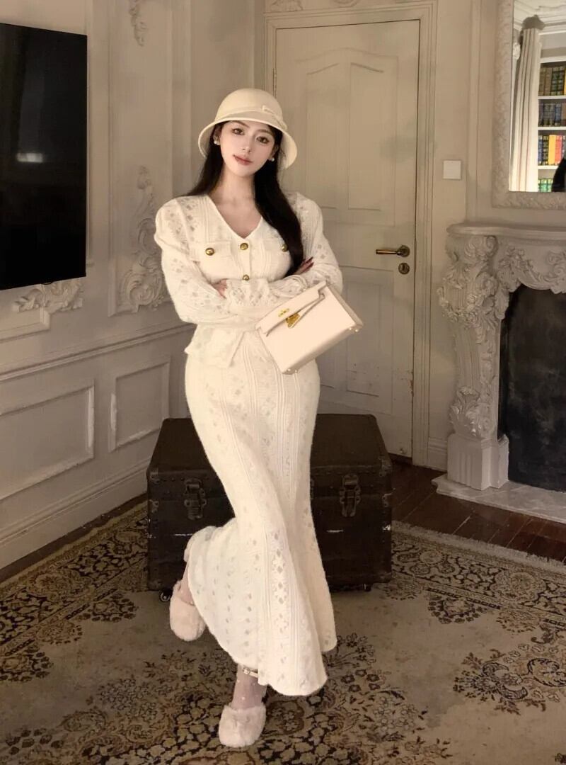 甘いホットガールスーツ冬レース V ネックカーディガン尻ラップロングスカート 2 点セット 大人ガーリー スウィート キュート カジュアル ウィンター 冬物 Vネック