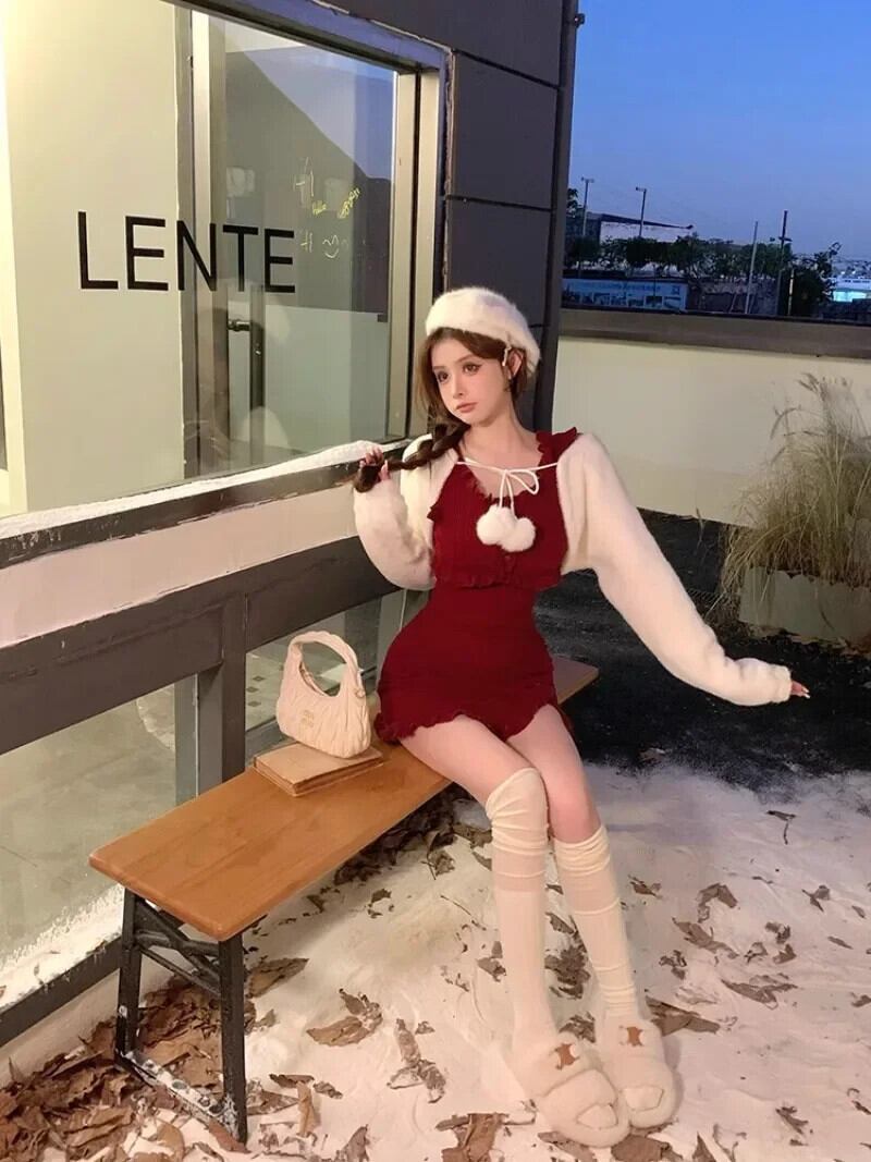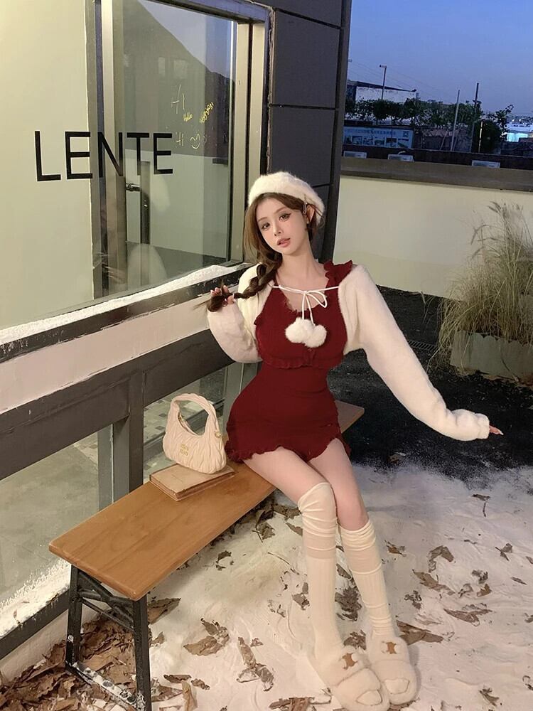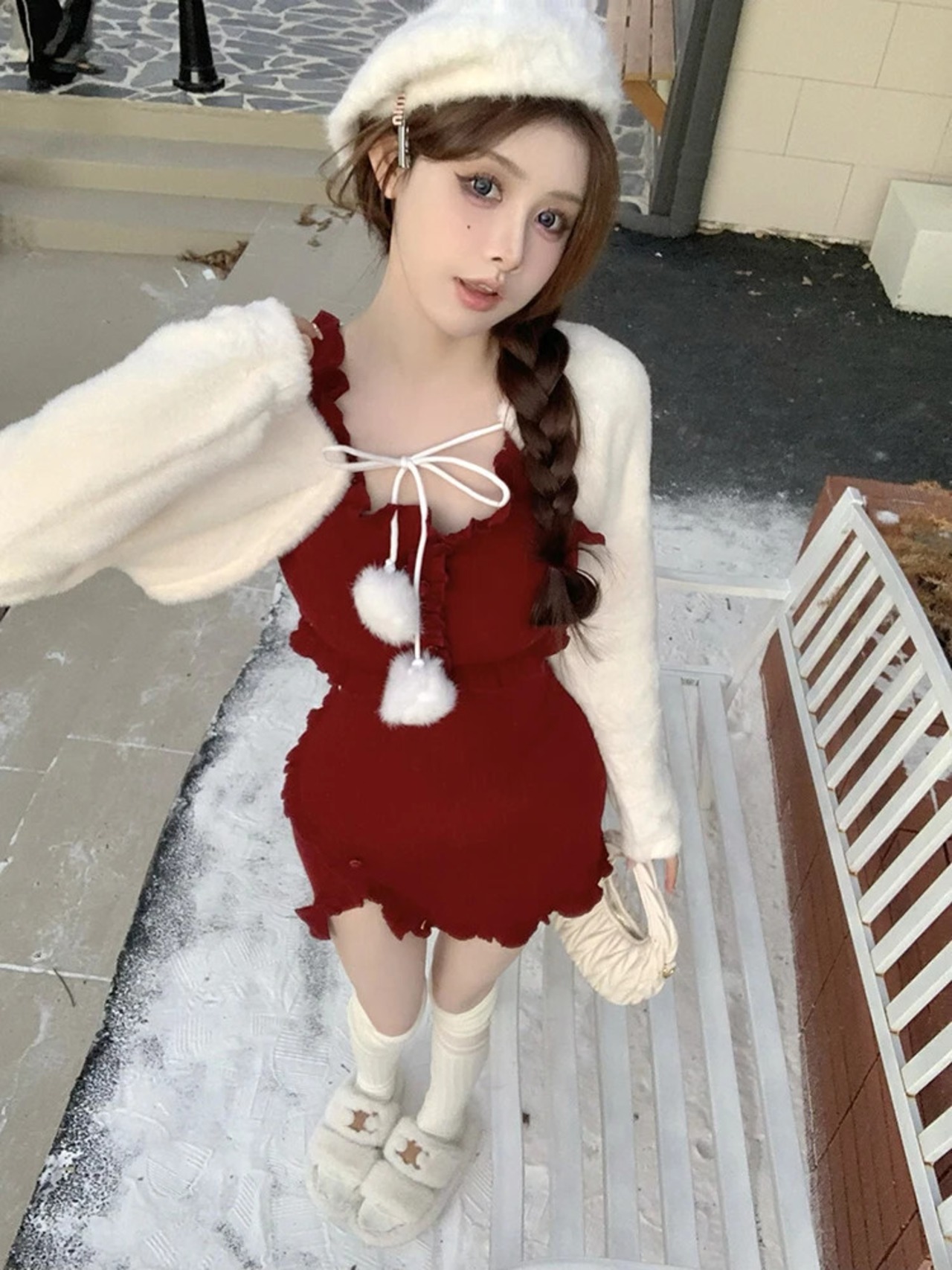 スイートホットガールクリスマススーツ秋/冬ショートぬいぐるみショールレトロレッドセクシーストラップショートドレスツーピースセット 大人ガーリー スウィート キュート カジュアル オータム 秋物 ウィンター 冬物
