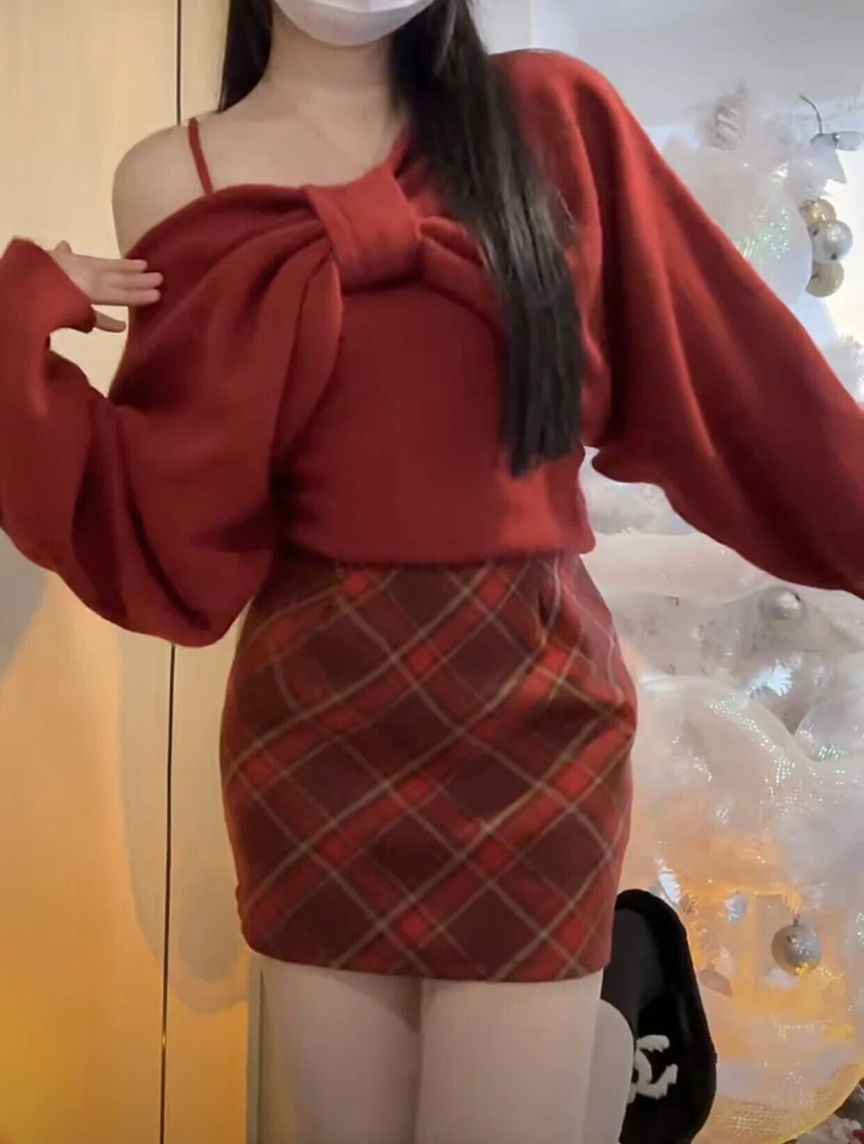 甘いホットガールスーツ秋と冬弓オフショルダーショールニットキャミソールチェック柄スカート 3 点セット リボン 大人ガーリー スウィート キュート カジュアル オータム 秋物 ウィンター 冬物