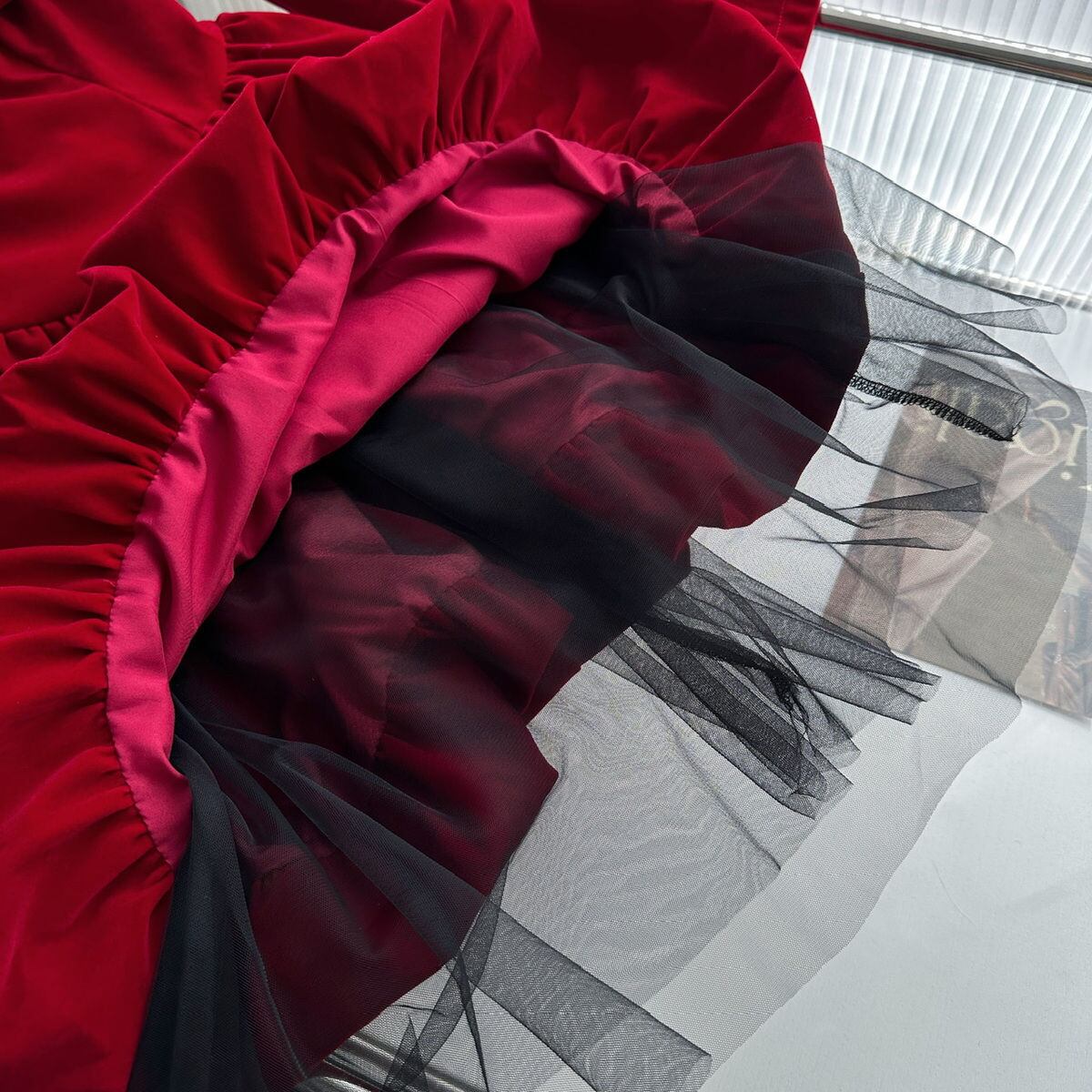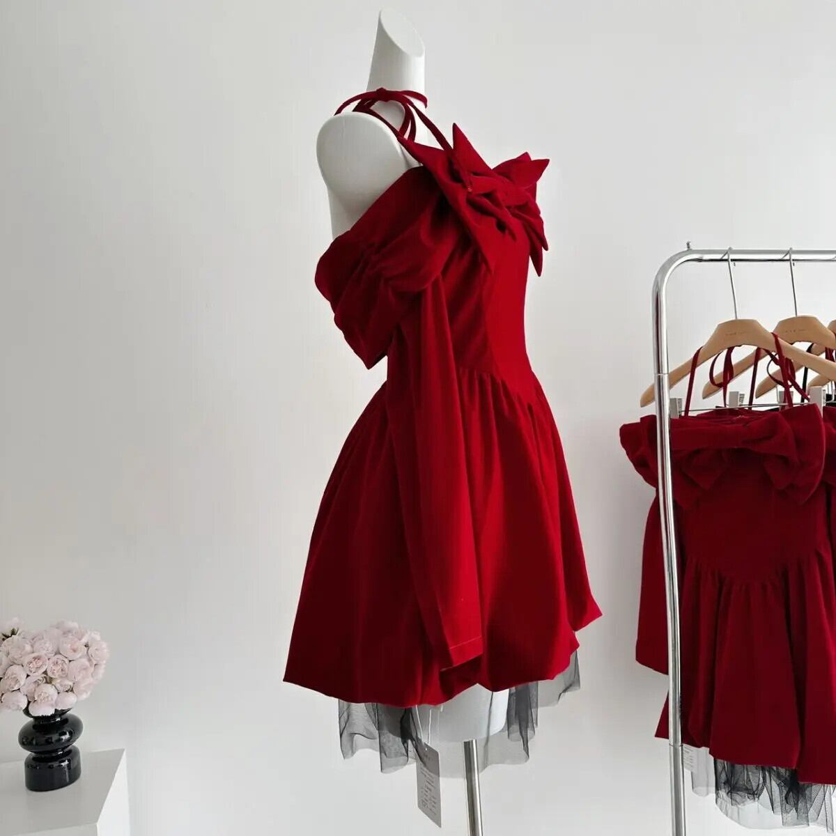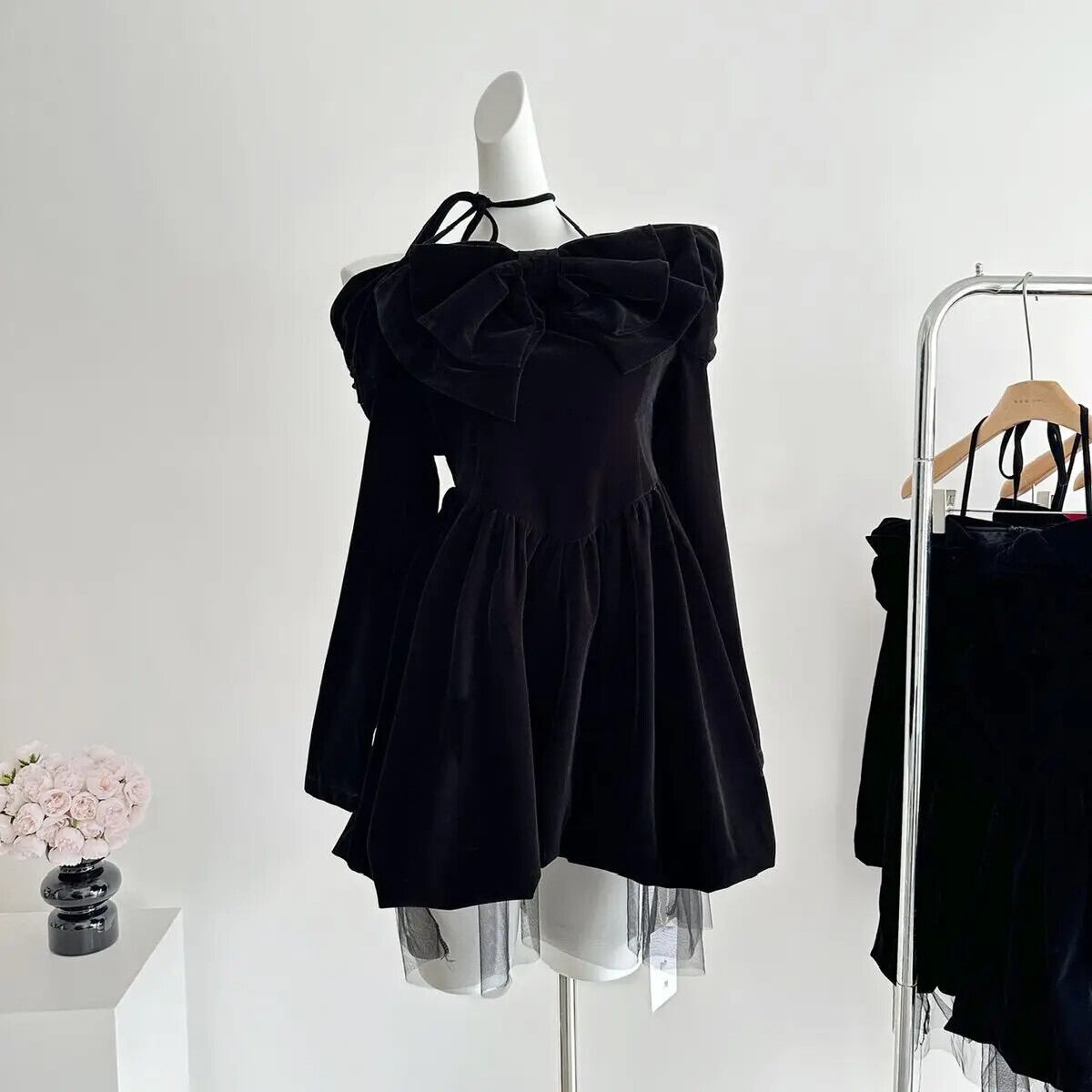 甘いホットガールホルターネックベルベットドレス秋/冬長袖スリムフィットオフショルダー A ラインメッシュパッチワークドレス ロング 大人ガーリー スウィート キュート カジュアル オータム 秋物 ウィンター 冬物 Aライン