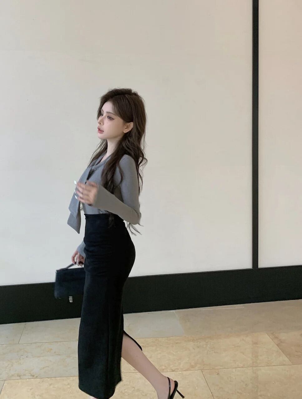 スイートホットガールスーツ秋スリムフィット長袖 V ネックニットトップウエストヒップラップスカート 2 点セット ロング 大人ガーリー スウィート キュート カジュアル オータム 秋物 Vネック