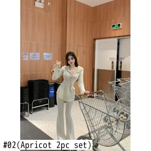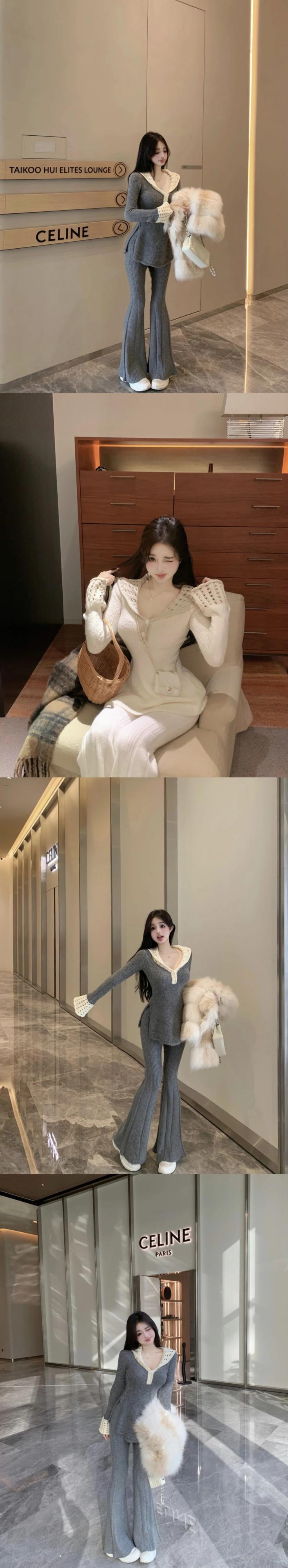甘いホットガールスーツ冬アウトスリムフィットニットトップウエストマイクロフレアパンツ 2 点セット レッド 大人ガーリー スウィート キュート カジュアル ウィンター 冬物