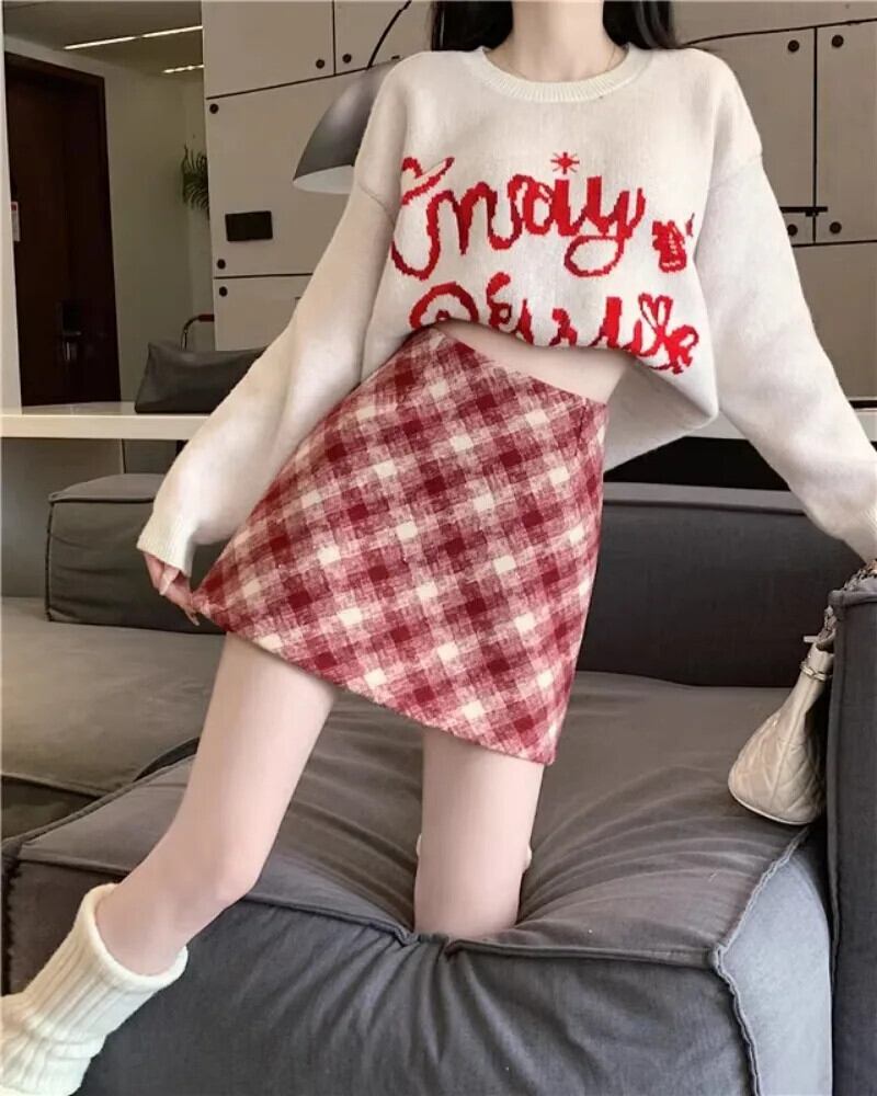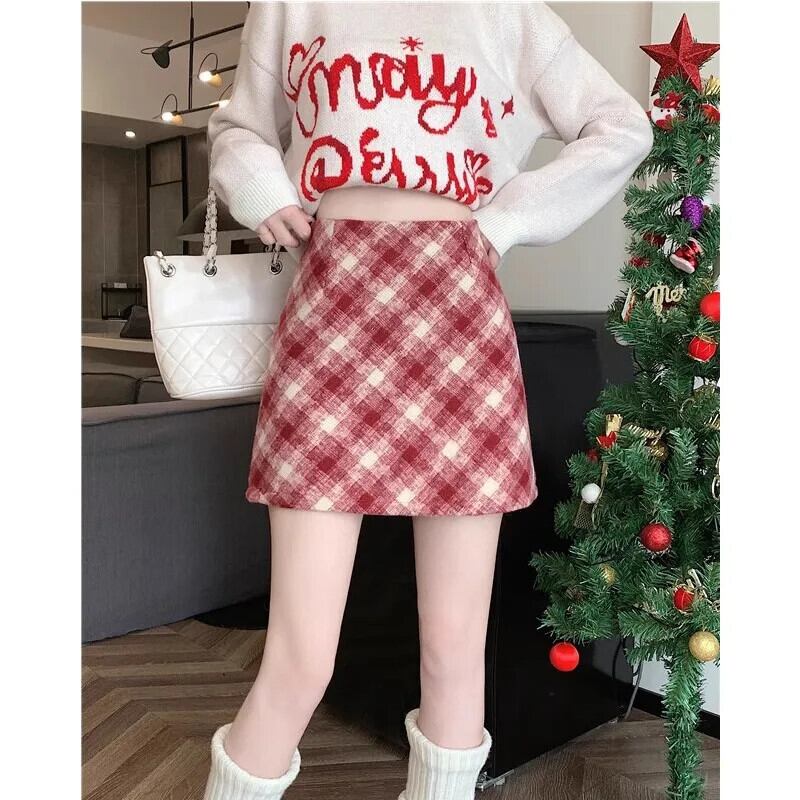 ホットガールクリスマスと年ウールミニスカート秋と冬通勤赤チェック柄 A ラインヒップラップショートスカート レッド オータム 秋物 ウィンター 冬物 Aライン