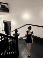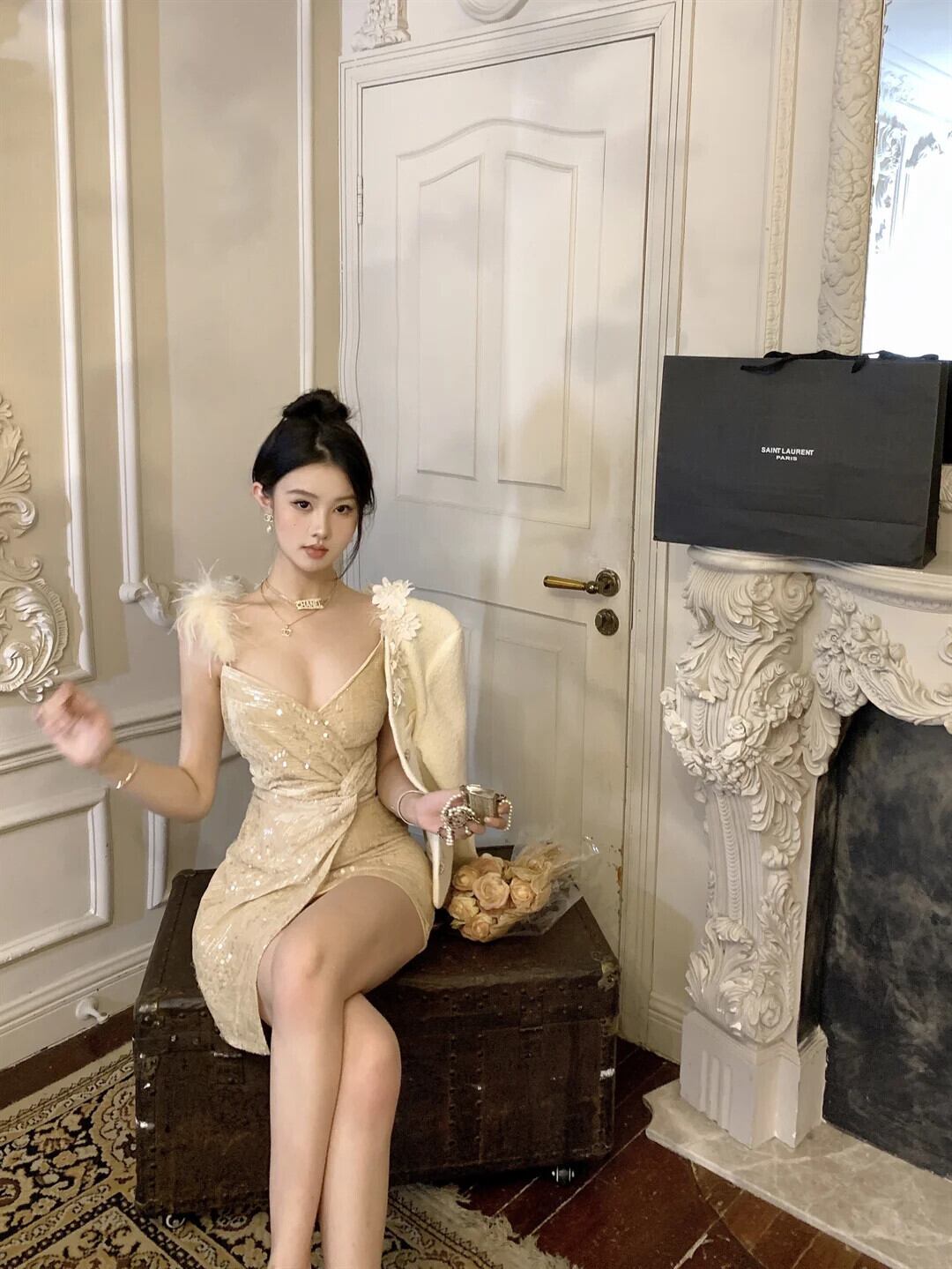 フレンチスイートホットガールショートドレス秋毛皮テルスリムフィットストラップスパンコールラップヒップイブニングドレス 大人ガーリー スウィート キュート カジュアル オータム 秋物
