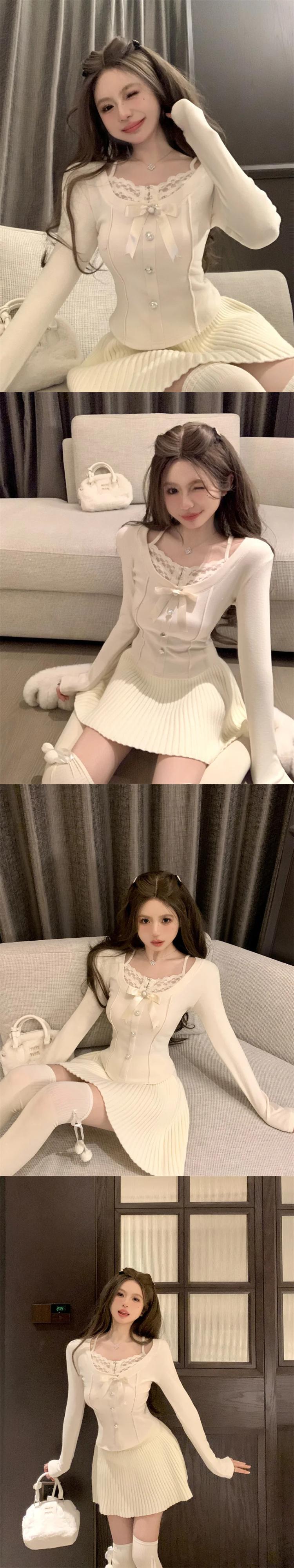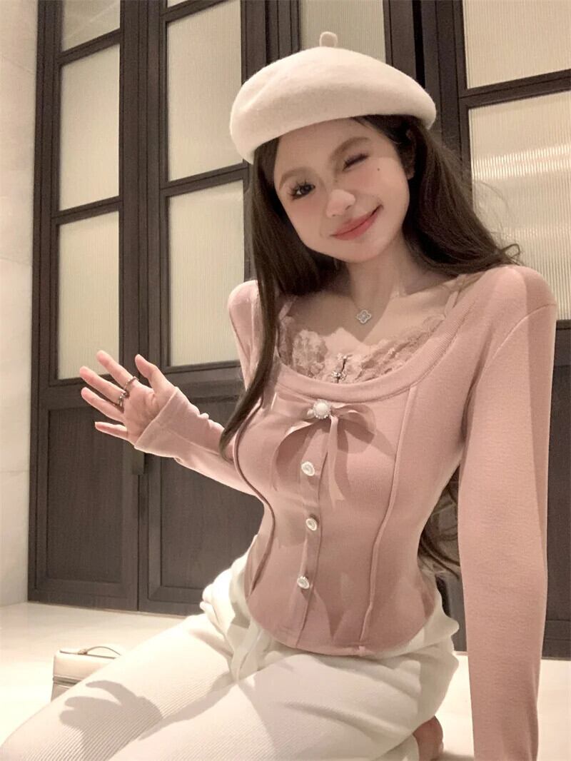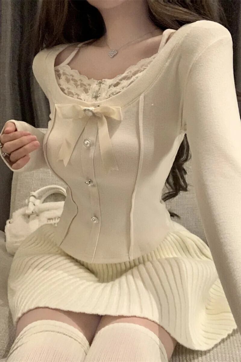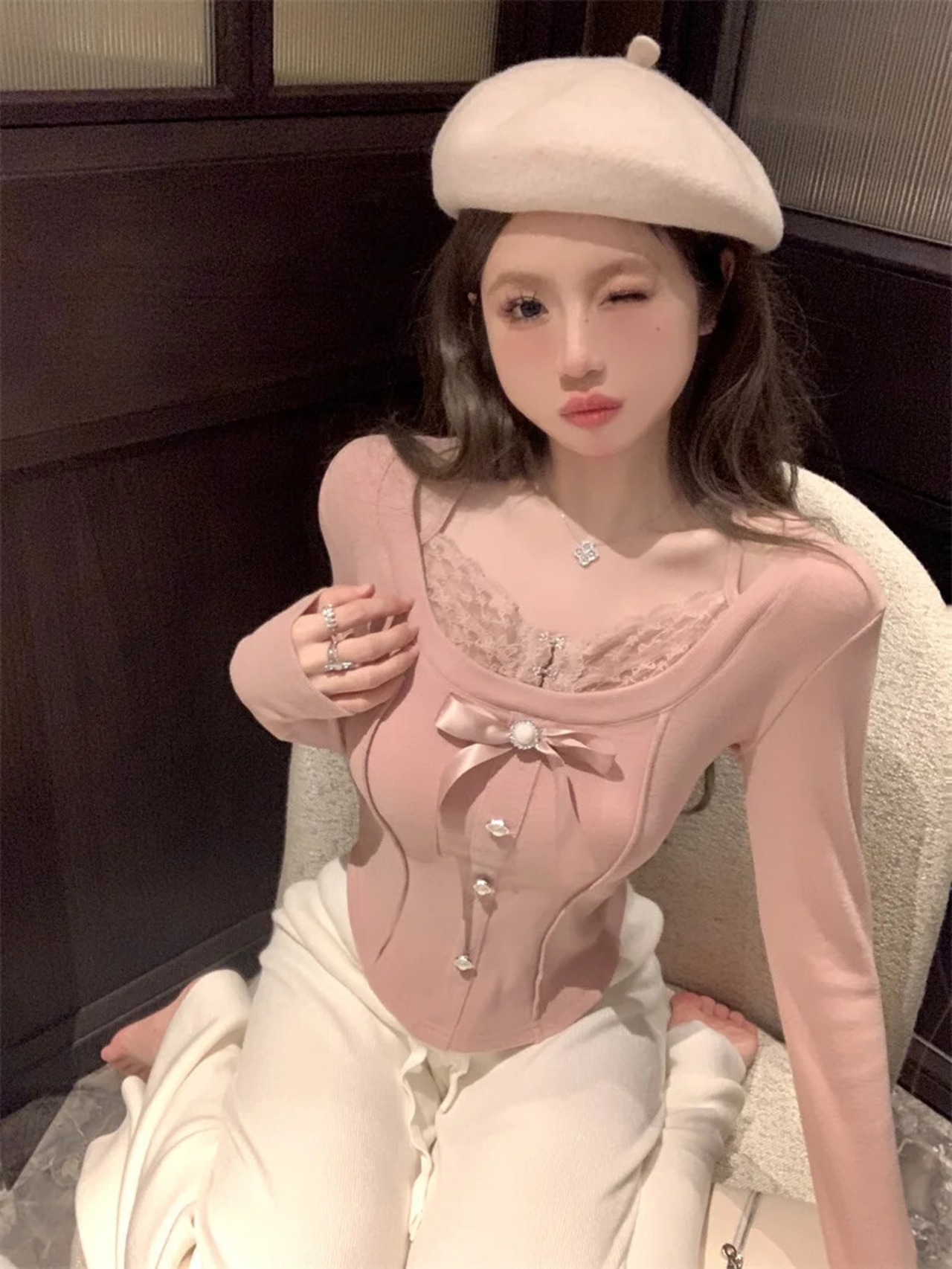 甘いホットガールレースパッチワーク長袖ボトムシャツ冬純粋セクシースリムフィットフェイクトップ2枚 ロング 大人ガーリー スウィート キュート カジュアル ウィンター 冬物 ピュア