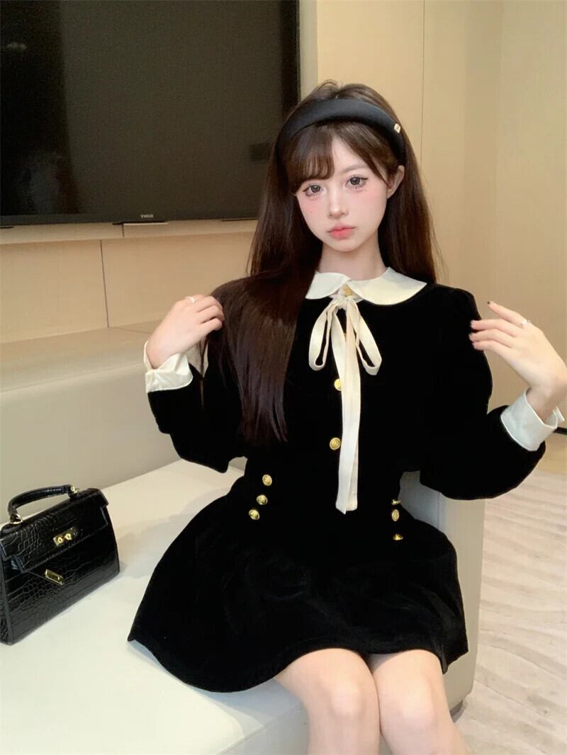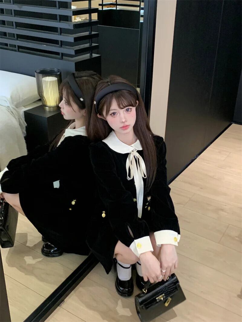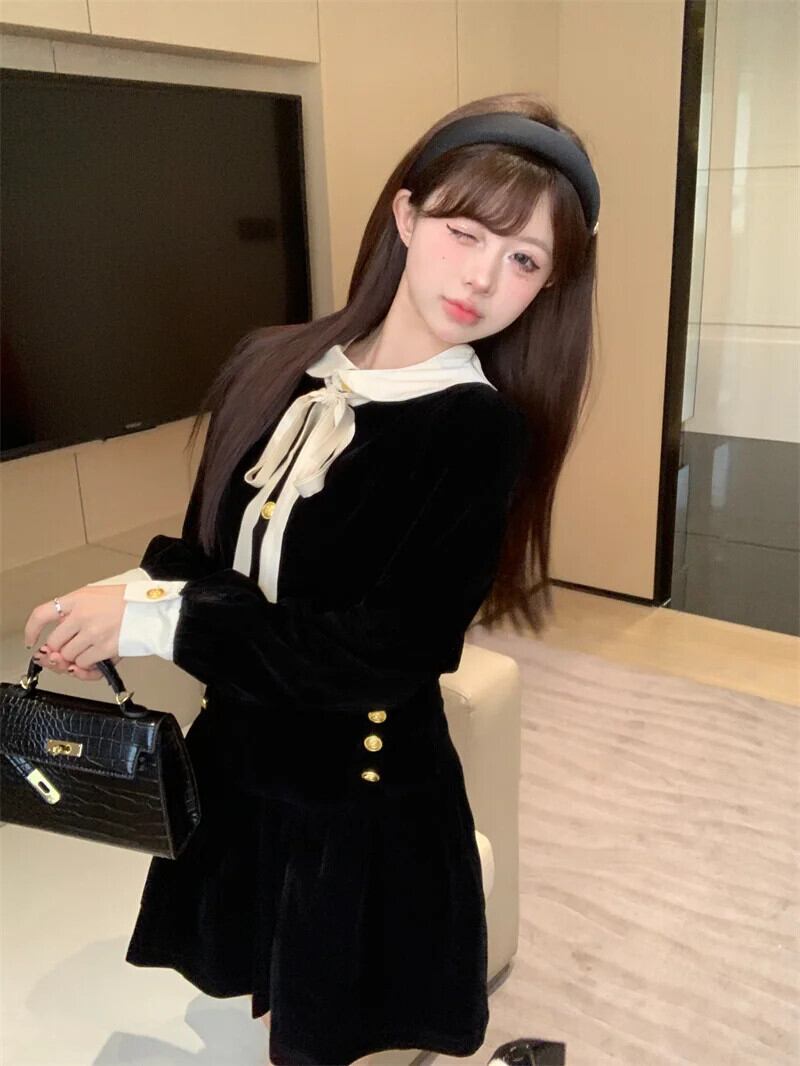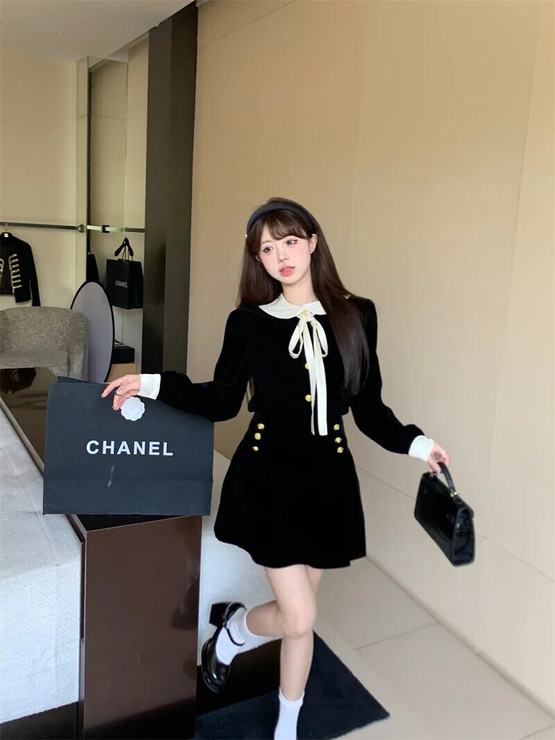 フレンチスイートホットガールスーツ冬ベルベットレースアップシャツウエストAラインミニスカートツーピースセット 大人ガーリー スウィート キュート カジュアル ウィンター 冬物