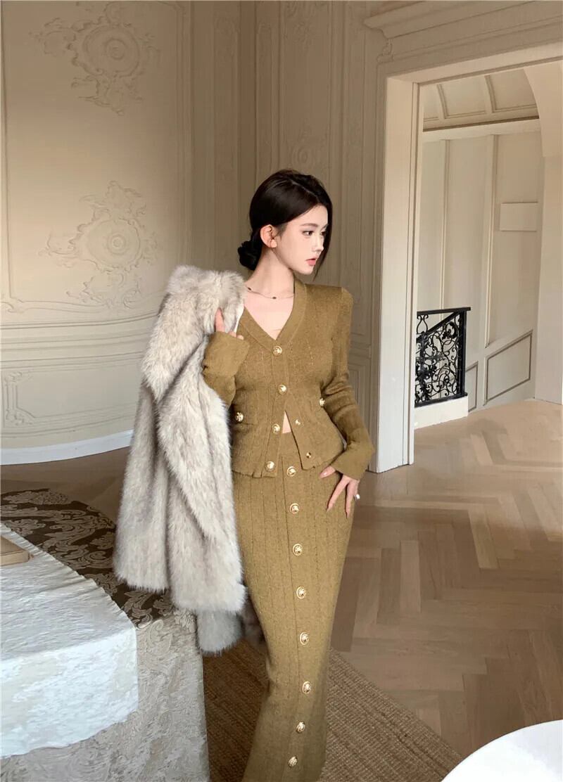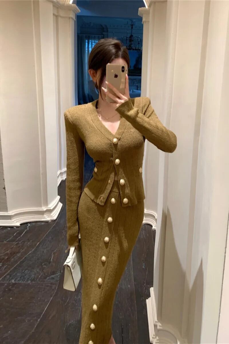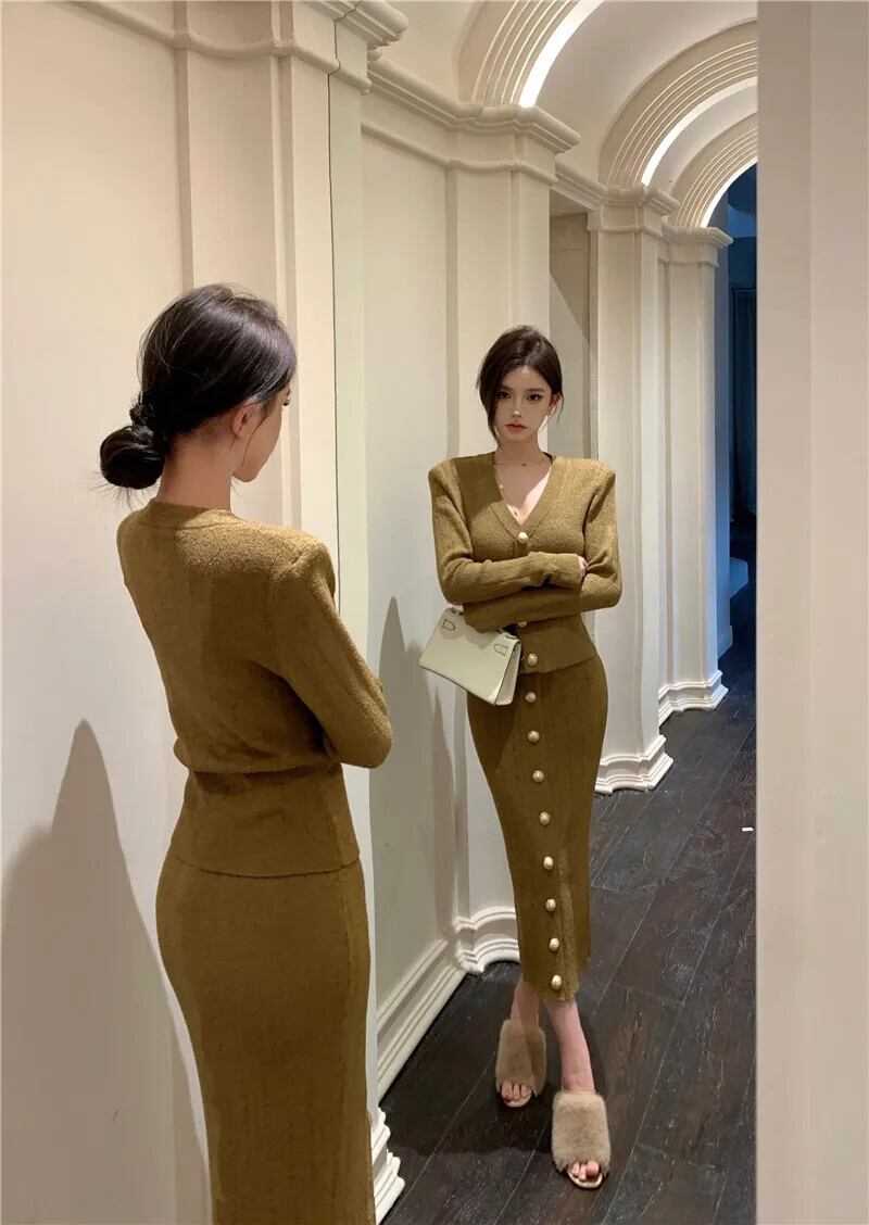 スイートガールスーツ冬スリムフィット長袖ニットカーディガンウエストロングスカートツーピースセット 大人ガーリー スウィート キュート カジュアル ウィンター 冬物