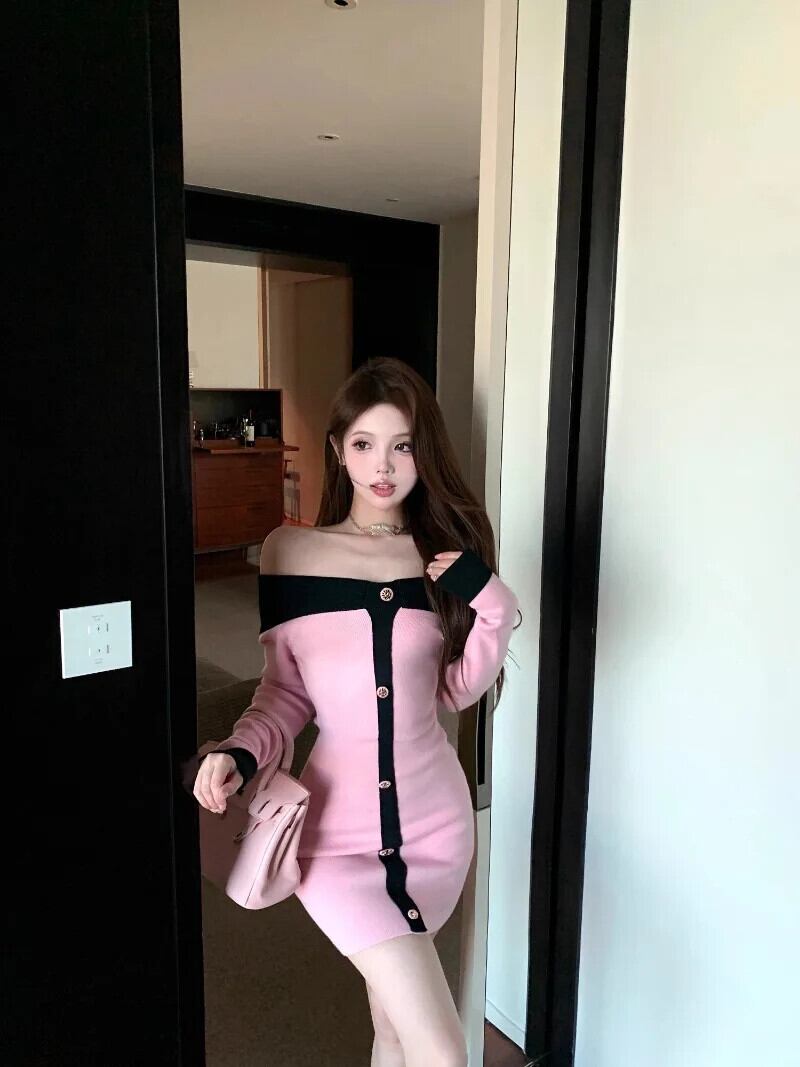 甘いホットガールオフショルダー長袖ニットドレス冬タイトラップヒップショートドレス ロング 大人ガーリー スウィート キュート カジュアル ウィンター 冬物