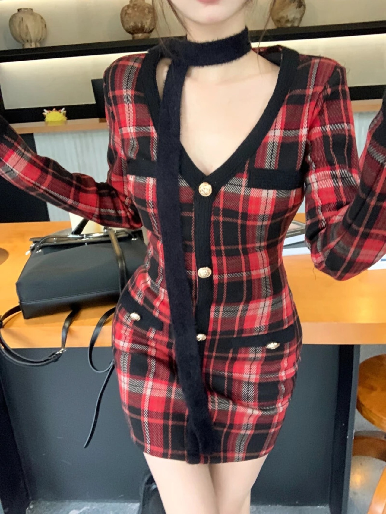 甘いホットガール V ネックニットドレス冬豪華長袖チェック柄スリムフィットヒップラップショートドレス ロング 大人ガーリー スウィート キュート カジュアル ウィンター 冬物 Vネック