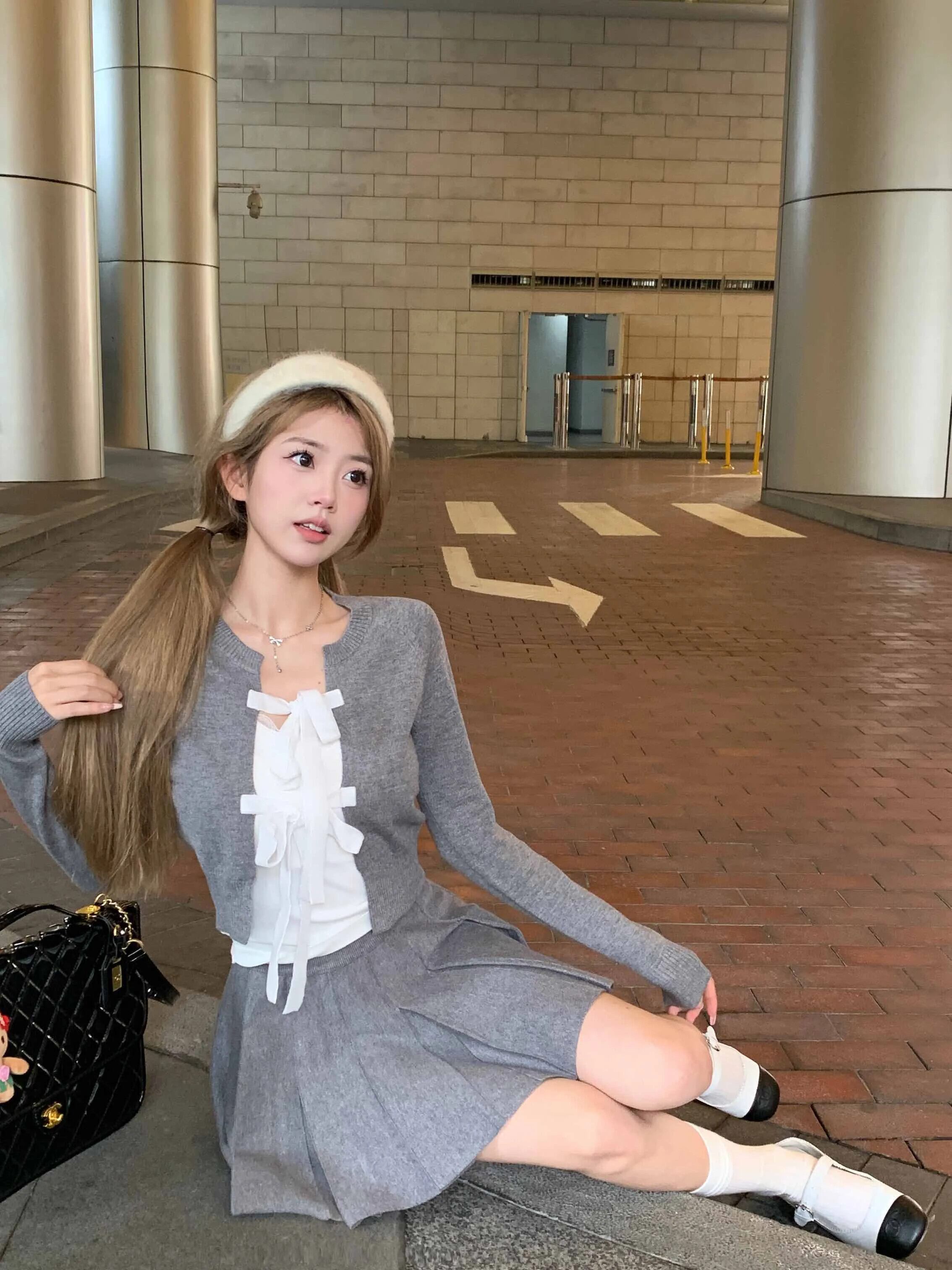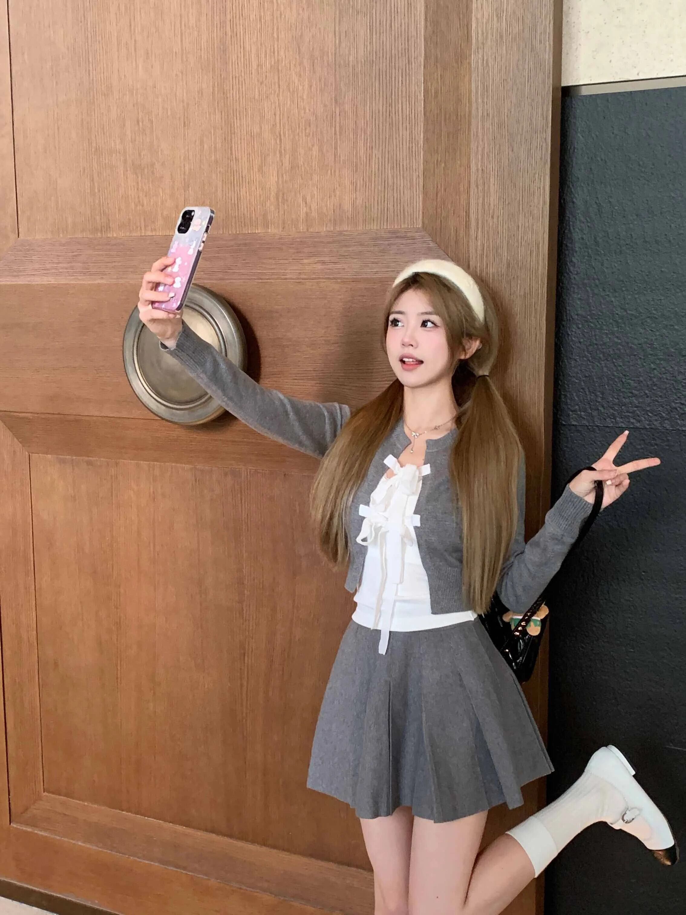 スーツ秋長袖ベルベット蝶ネクタイカーディガンプリーツミニスカート 2 点セット ロング リボン オータム 秋物