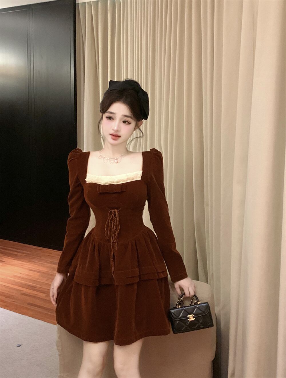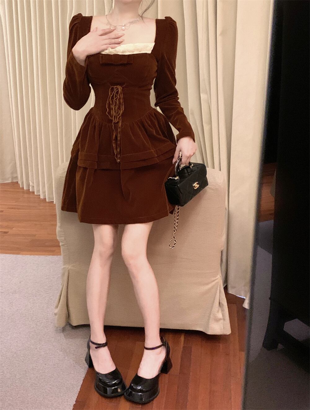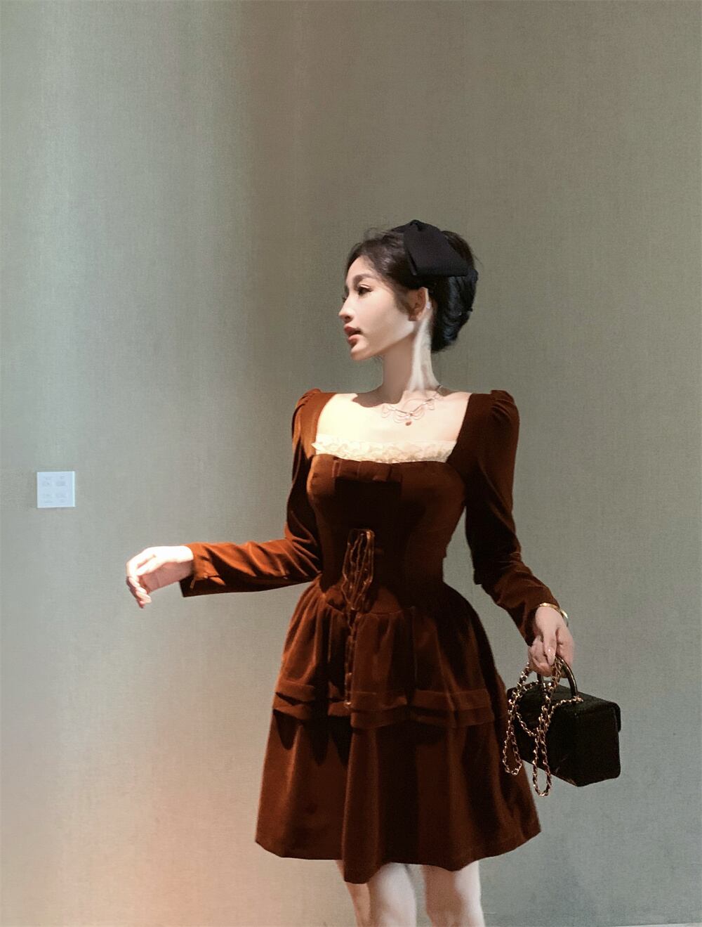 甘いホットガールレトロスクエアカラーベルベットドレス冬バブルスリーブスリム A ラインショートドレス 大人ガーリー スウィート キュート カジュアル ウィンター 冬物 Aライン スクウェア