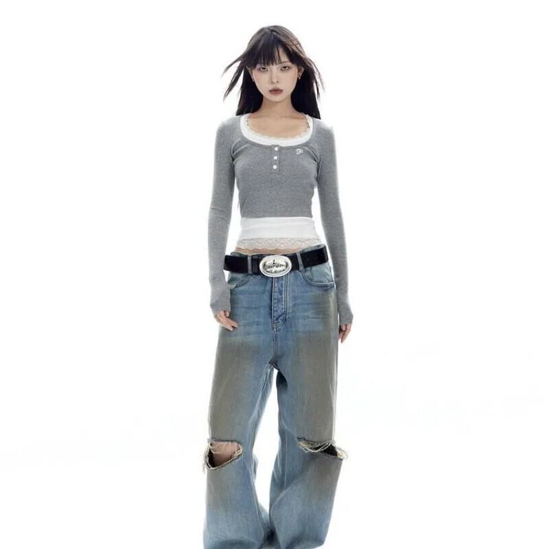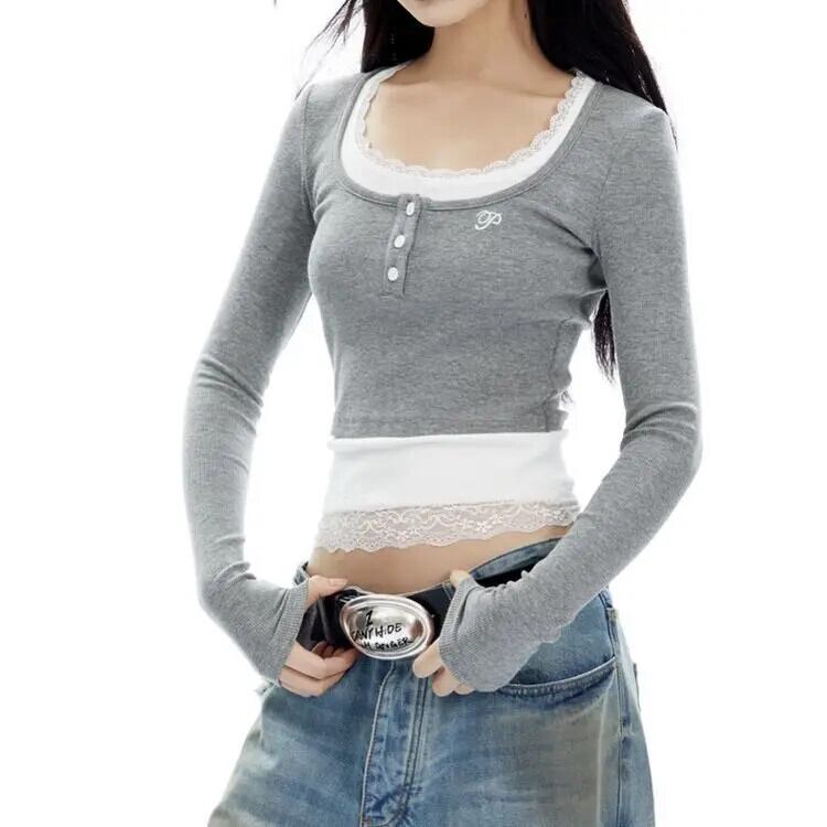 甘いホットガールレースパッチワーク偽ツーピーストップ春/夏ショートタイトフィット長袖シャツ ロング 大人ガーリー スウィート キュート カジュアル スプリング 春物 サマー 夏物