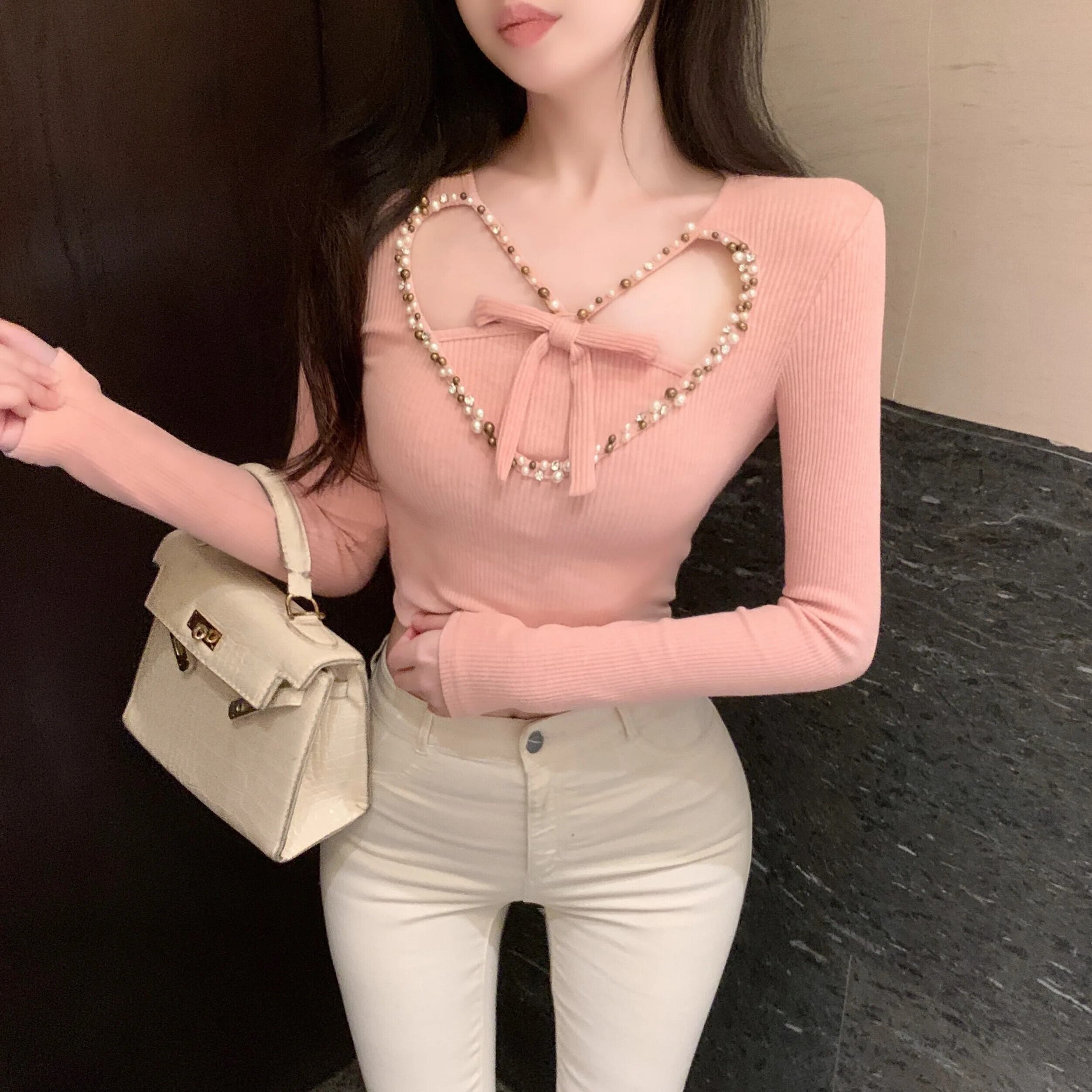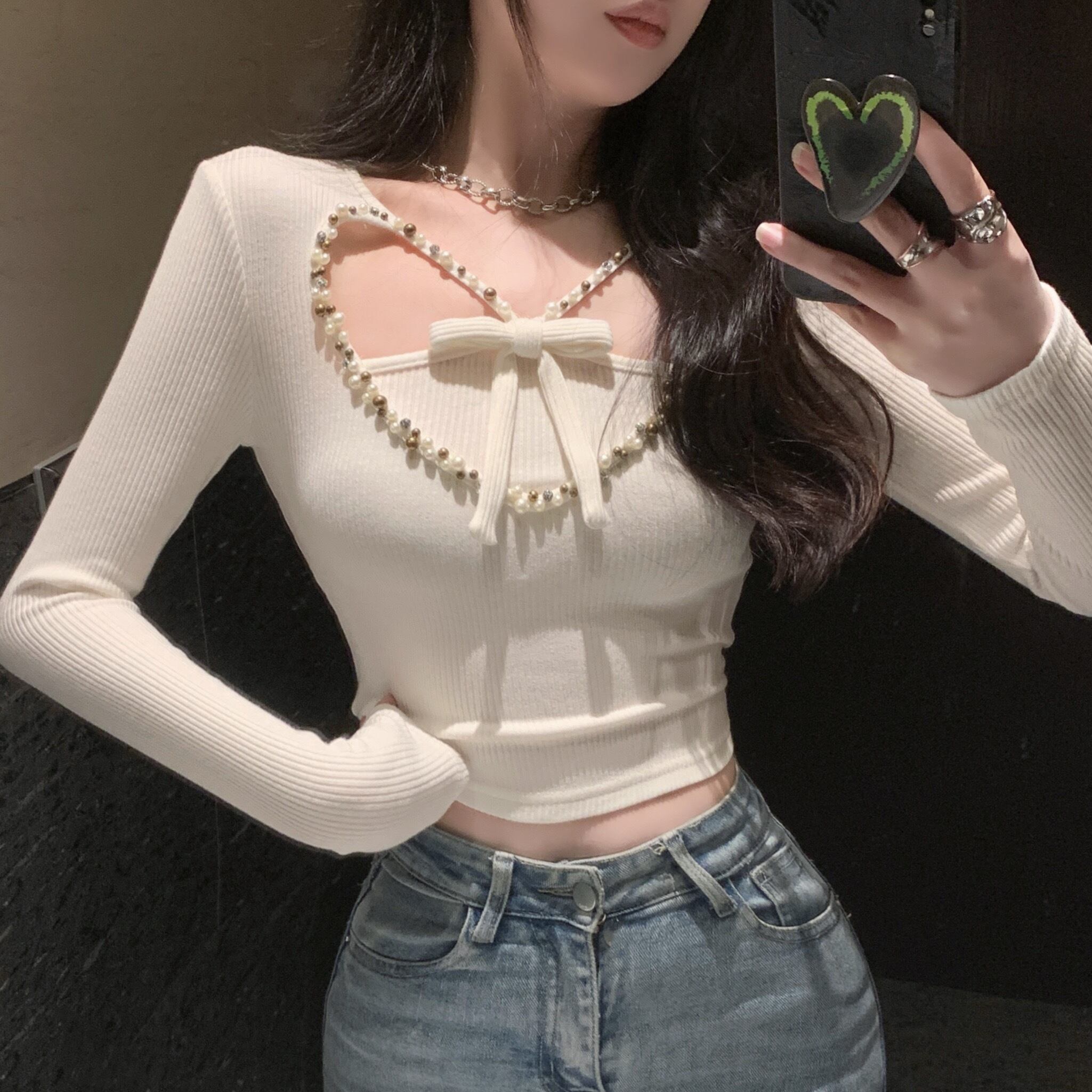 甘いホットガールセクシー V ネックピーチハート長袖 Tシャツリブスリムフィットショートプルオーバートップ ロング 大人ガーリー スウィート キュート カジュアル Vネック