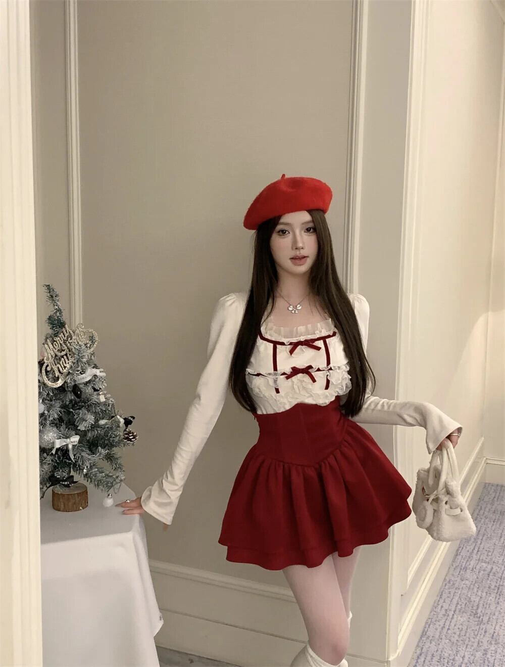甘いホットガール純粋セクシースーツ秋と冬レースパッチワークニットトップウエストふわふわミニスカート 2 点セット 大人ガーリー スウィート キュート カジュアル オータム 秋物 ウィンター 冬物 ピュア